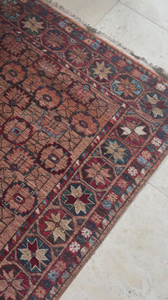 A bold hand-knotted Afghan Chobi rug featuring a tribal grid layout in burnt terracotta, indigo, and teal. The repeating hooked guls and star border motifs reflect nomadic Central Asian influence, adapted into a softer, vegetable-dyed palette. This piece blends structure and texture, making it ideal for modern rustic, eclectic, or grounded interiors.