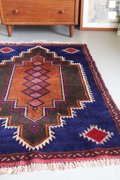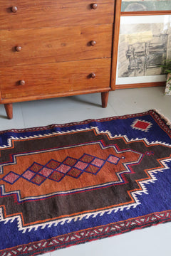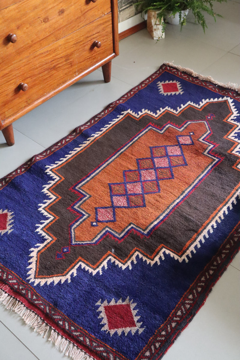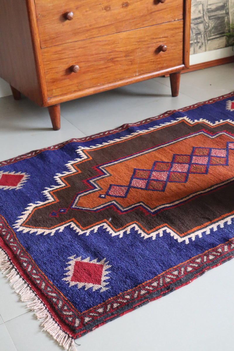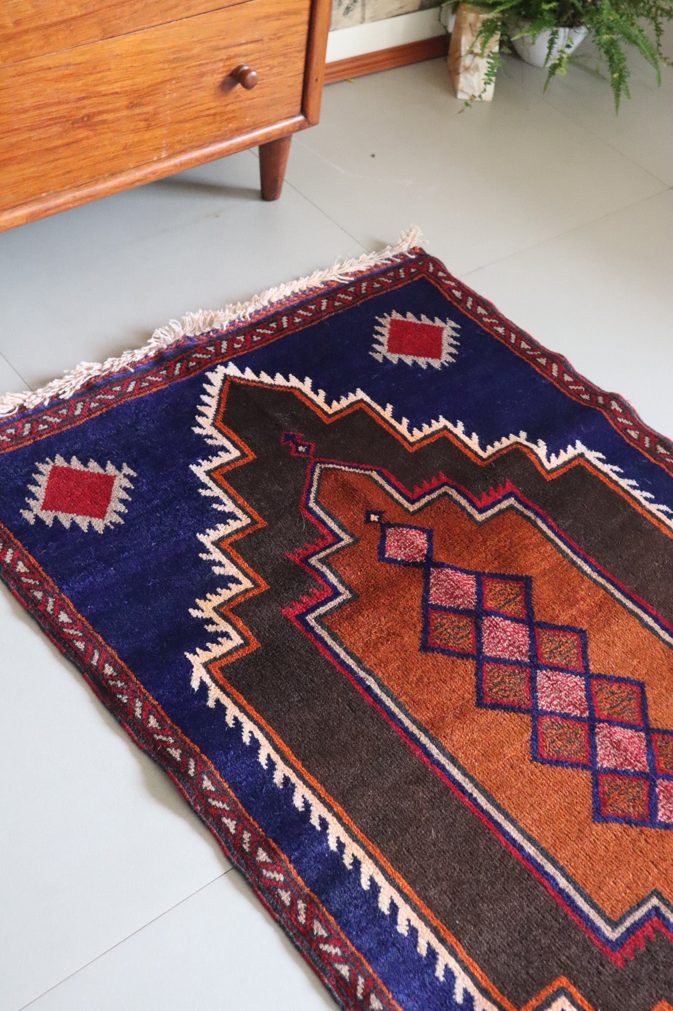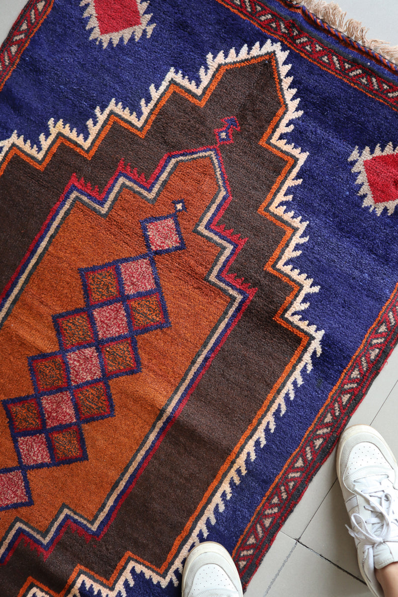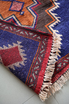 This Afghan Balouch rug stands out with its uncommon, less intricate design, yet offers a bold geometric pattern. The striking combination of royal blue, mixed with shades of brown, red, and orange, creates a unique visual appeal. It's a refreshing and distinctive piece for any setting.