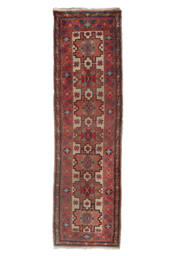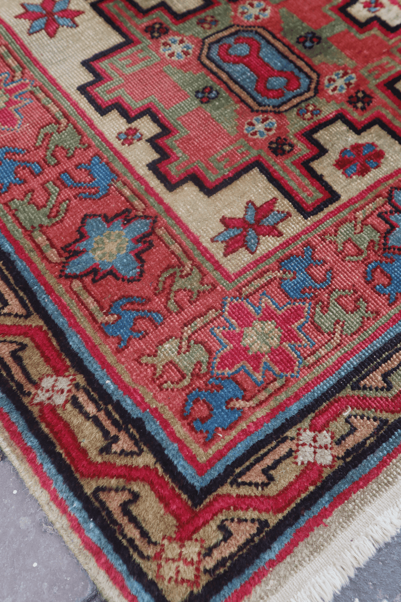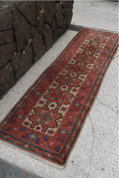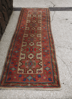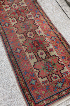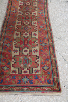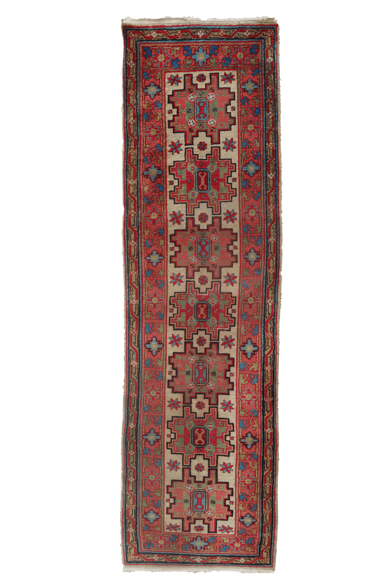 A vintage Caucasian runner with stacked latch-hook medallions, hourglass symbols, and star motifs on a soft beige field — a rare layout that brightens the usual Kazak geometry. The red border is filled with scrolling floral work in blue, rust, and green, giving the rug rhythm and warmth without crowding the design. The pile has softened from age and use, giving the whole piece a lived-in, balanced feel.