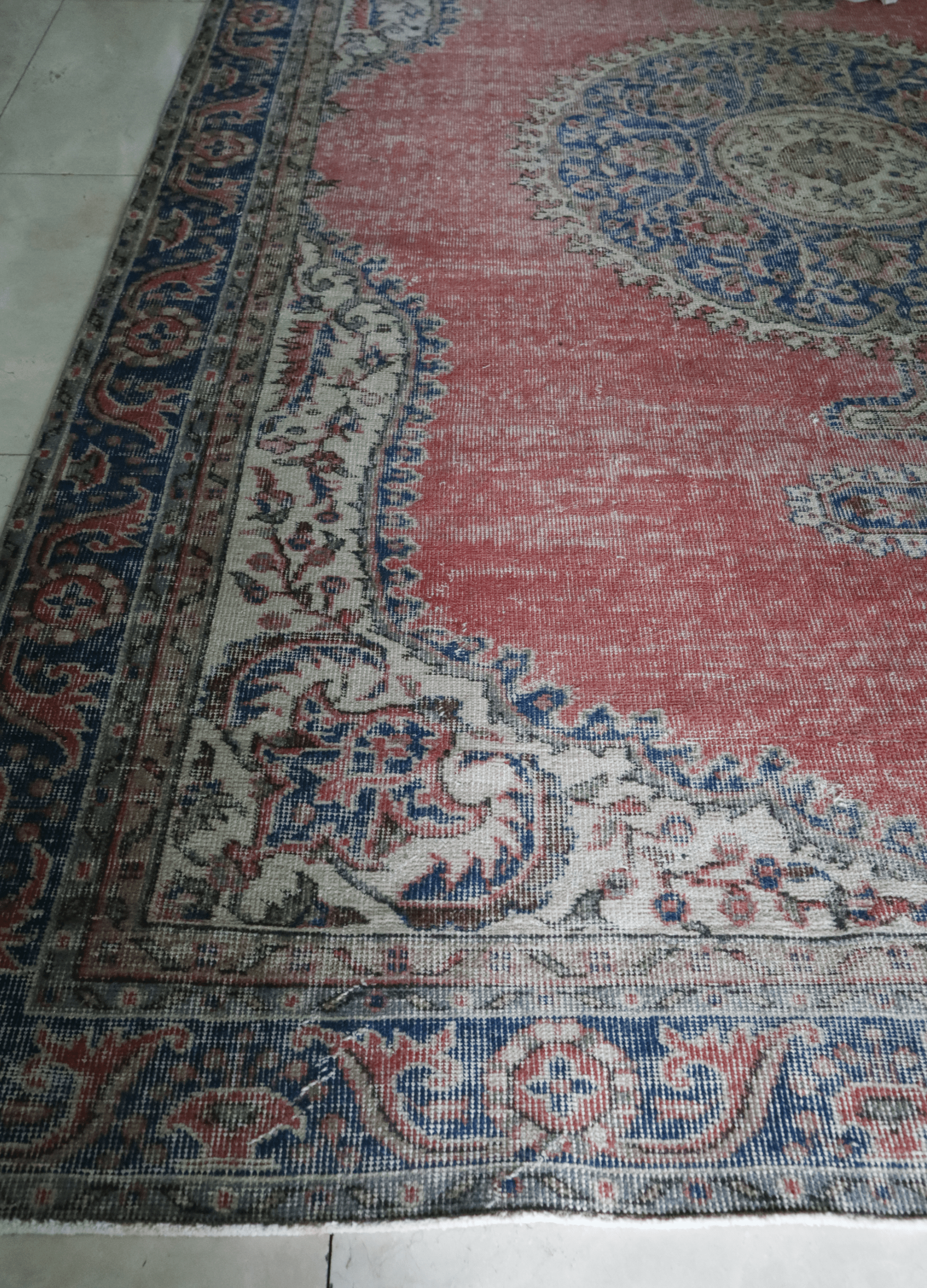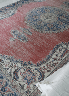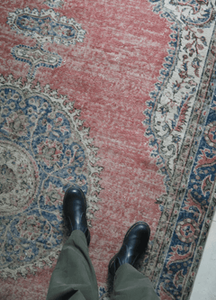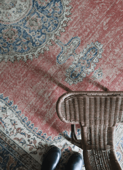 The palette feels a bit romantic but not sugary (soft coral, inky blue, and touches of sand and clay). The sheared, distressed pile gives it a matte, chalky finish that works well with both light, airy rooms and more traditional wood pieces.