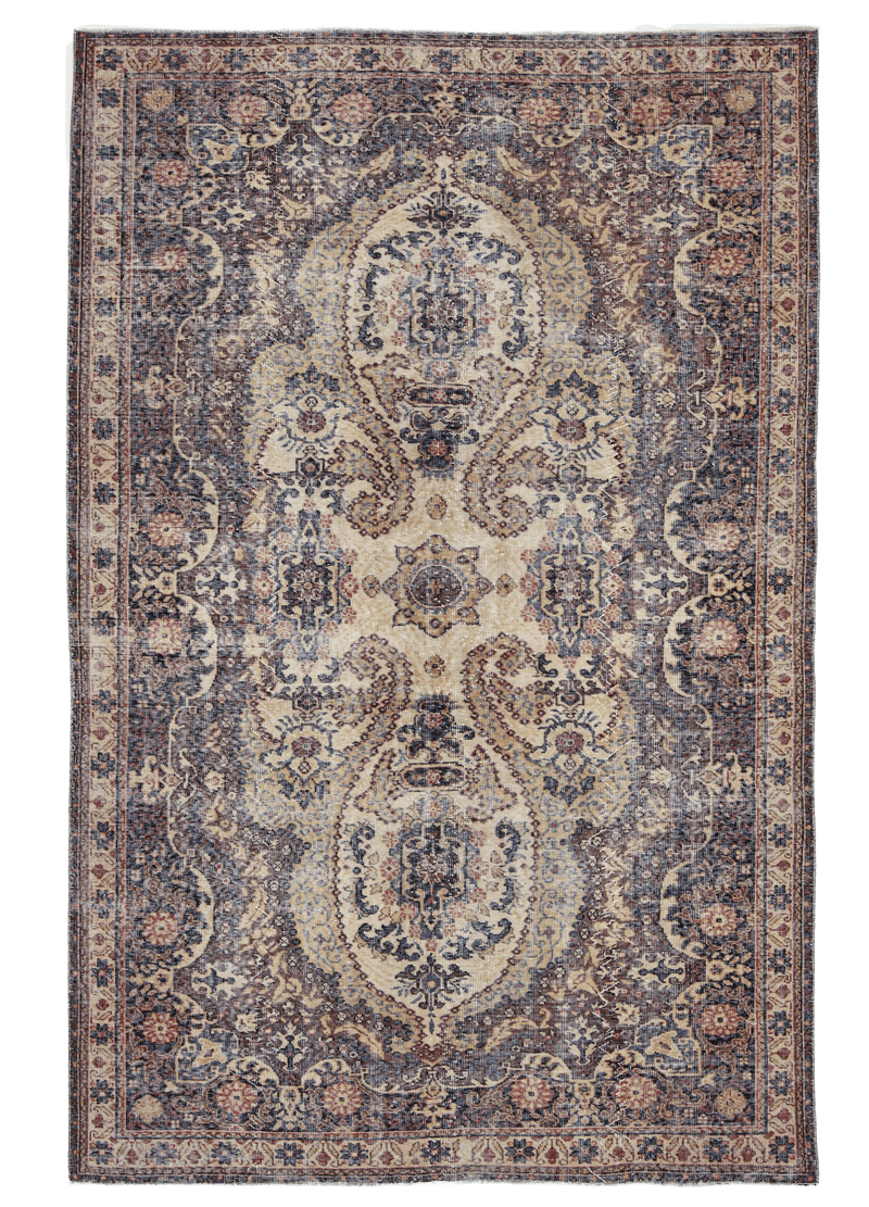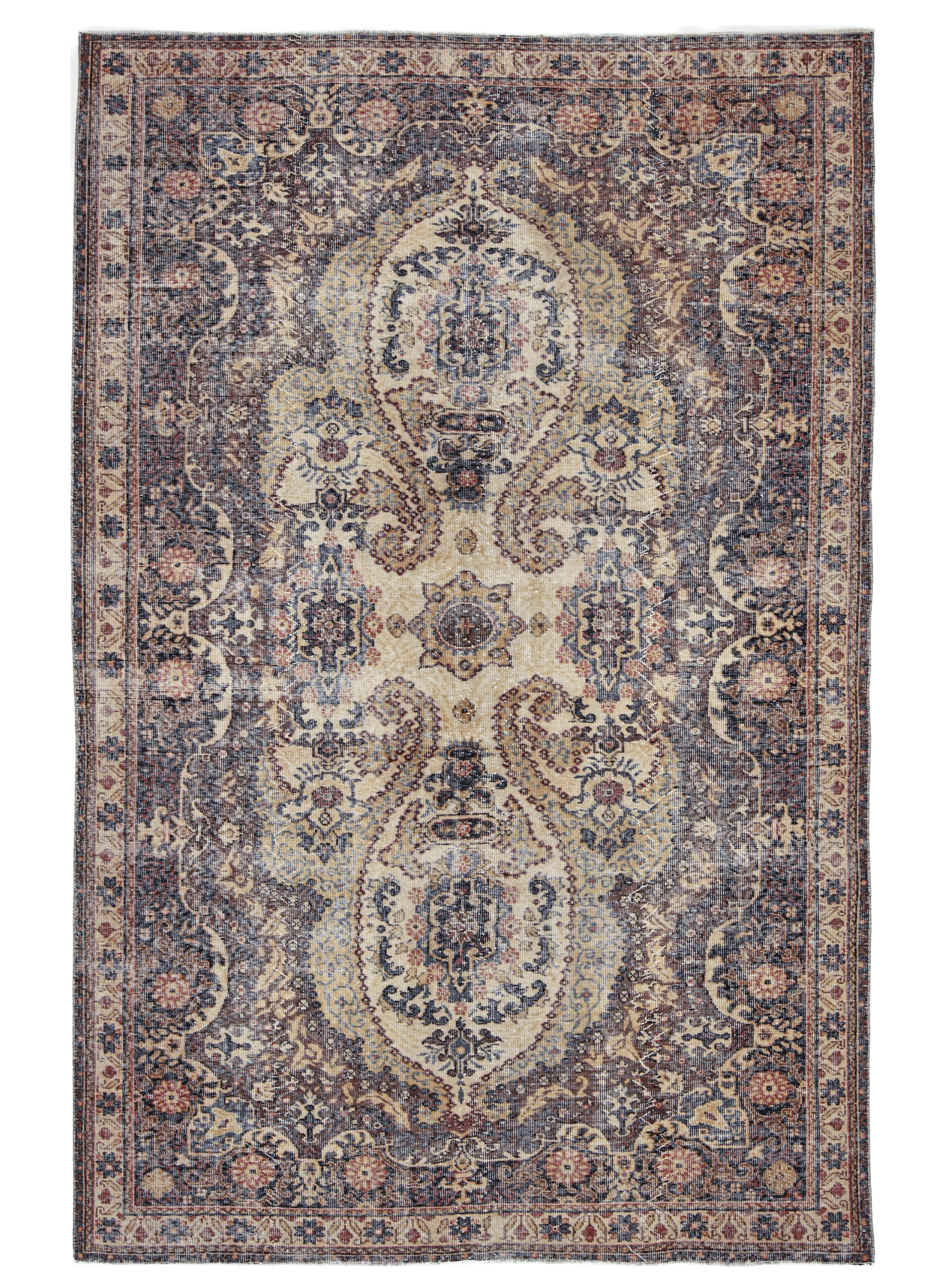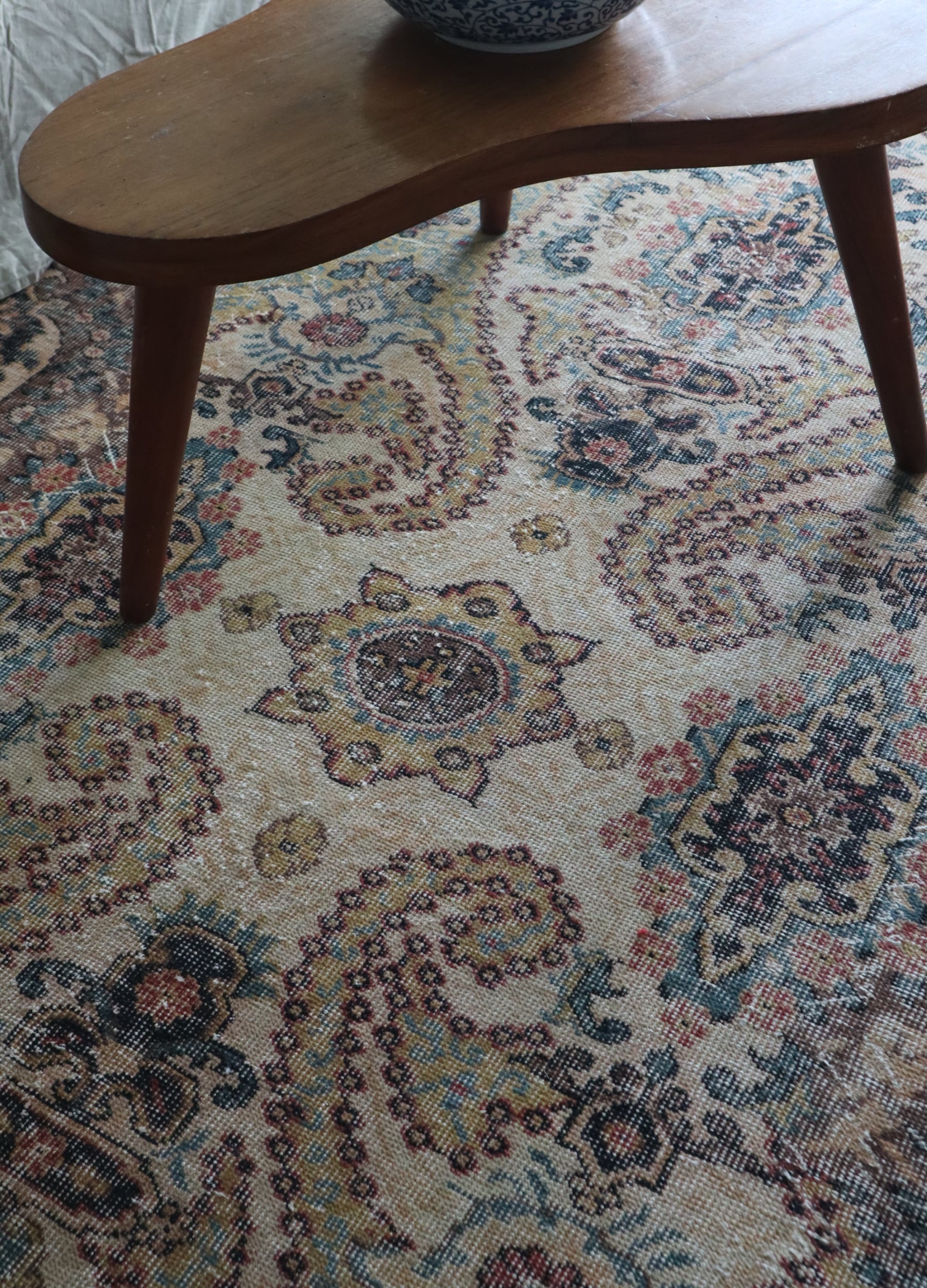 Hand-knotted, distressed Persian rug with an oversized medallion and swirling paisley motifs in softened olive, teal, gold and berry on an ivory ground. Visually rich, a bit bohemian, but still classic.