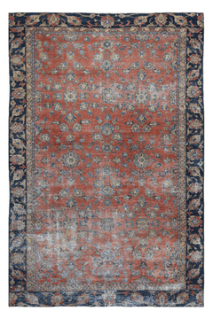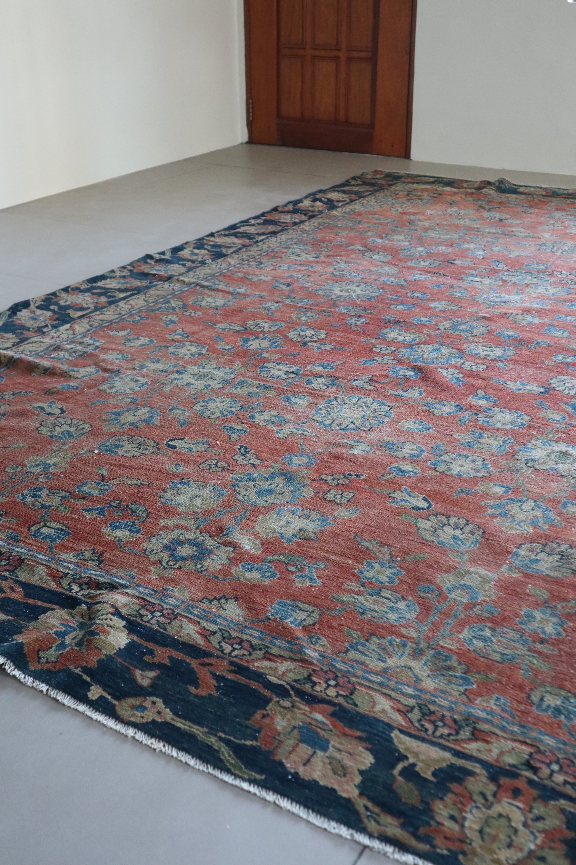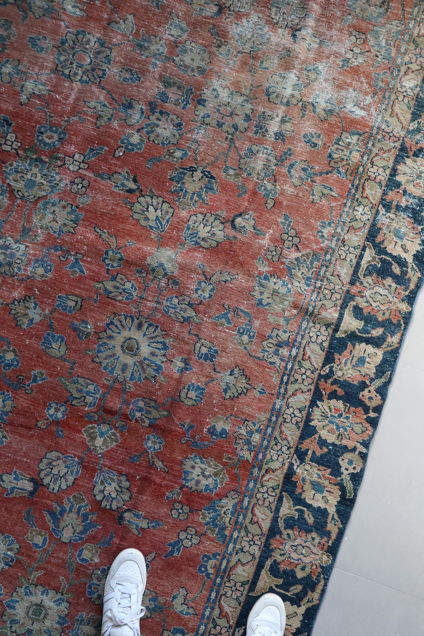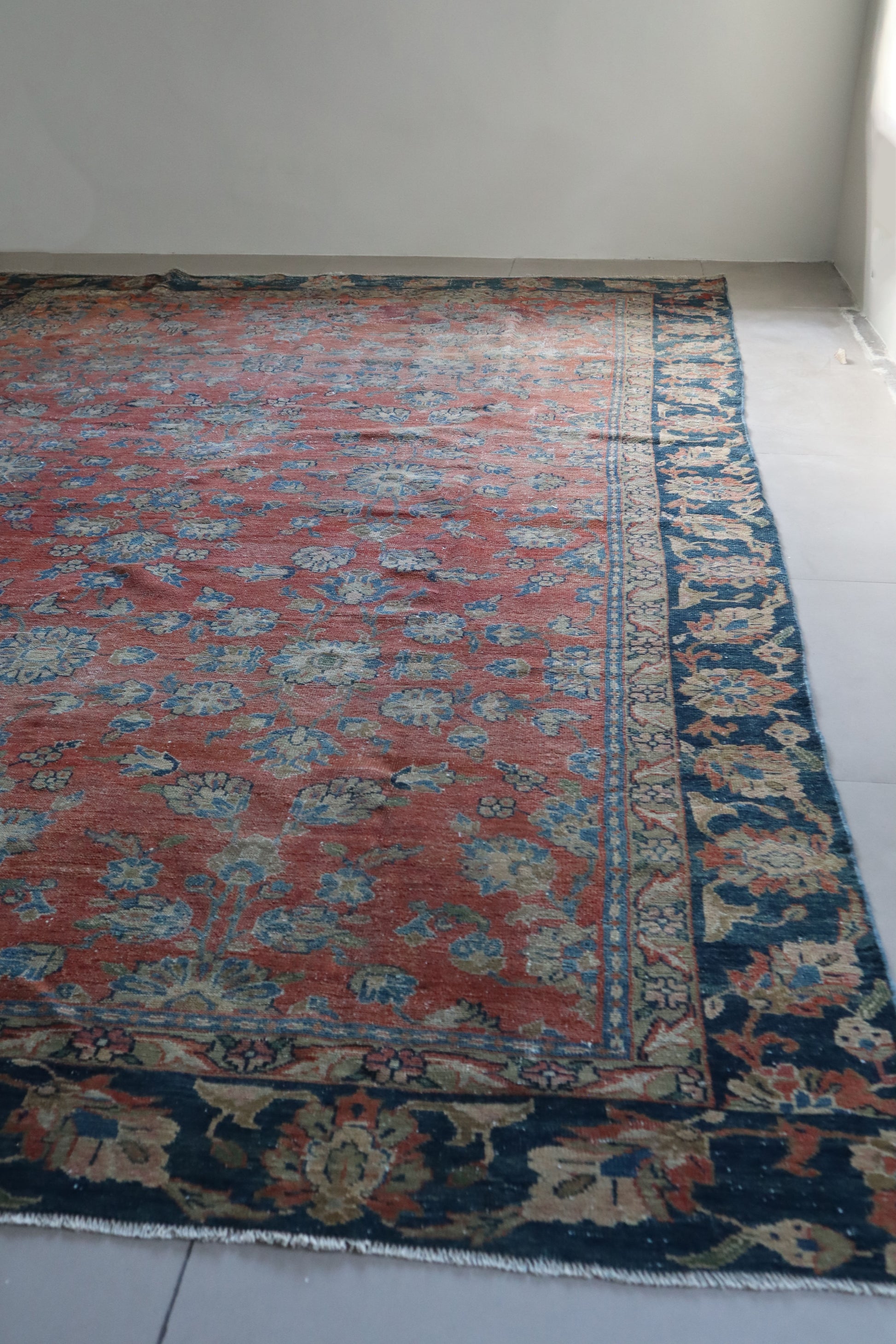 A finely woven antique Persian Mahal from the late 19th century, this piece carries the grace of time in every thread. Its allover floral design unfolds across a worn terracotta field, framed by a deep indigo border filled with scrolling vines and palmettes. The palette has mellowed into soft rusts, blues, and golds, making it easy to layer into both classic and contemporary spaces.