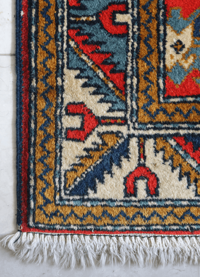 A vibrant Kazak rug with a plush wool pile that carries a lively palette of turquoise, madder red, mustard, and deep navy.