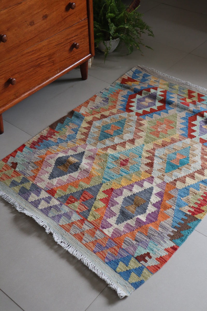 Add a vibrant touch to your home with this beautiful Kilim rug. With its colorful pattern and small size, it's perfect for adding character to any room.