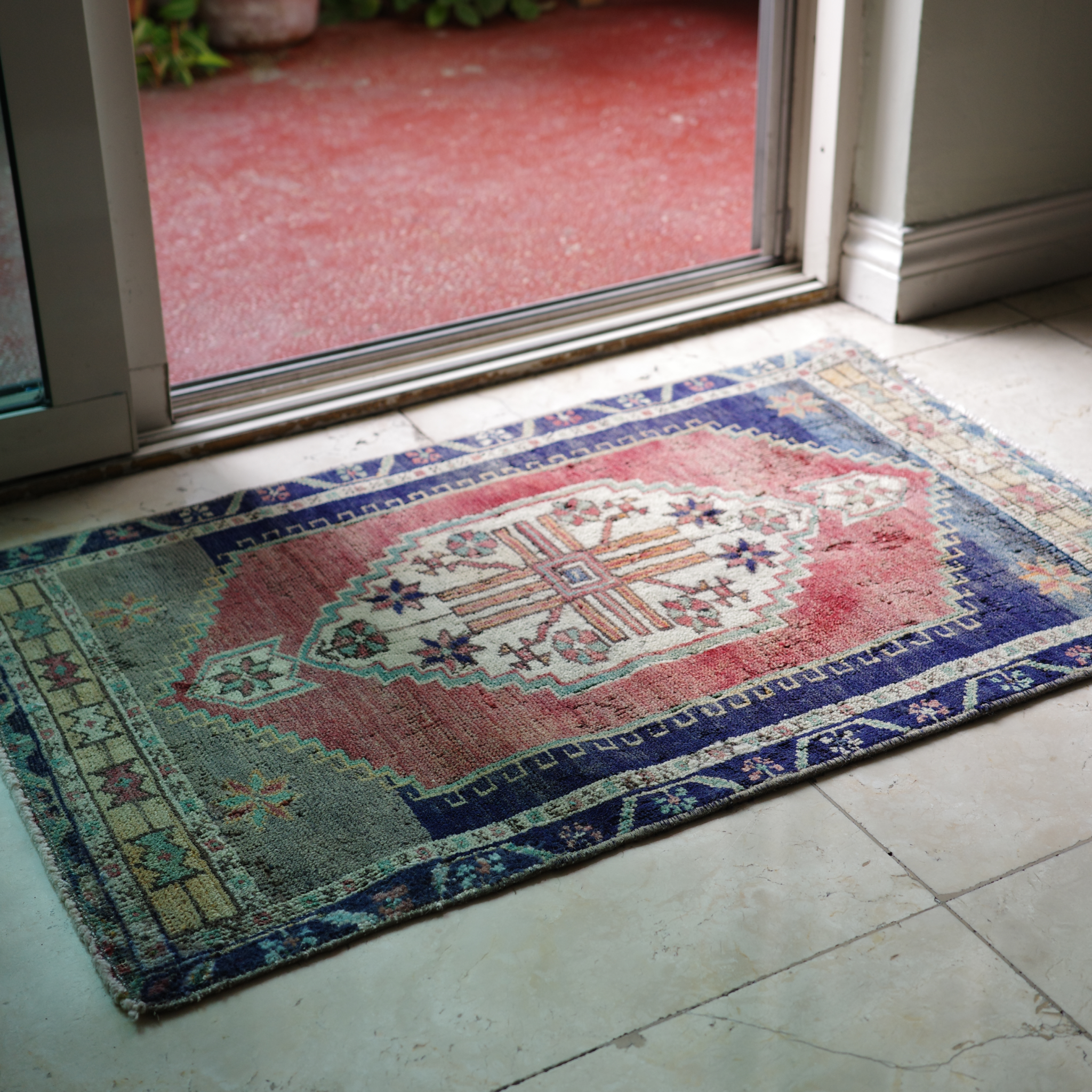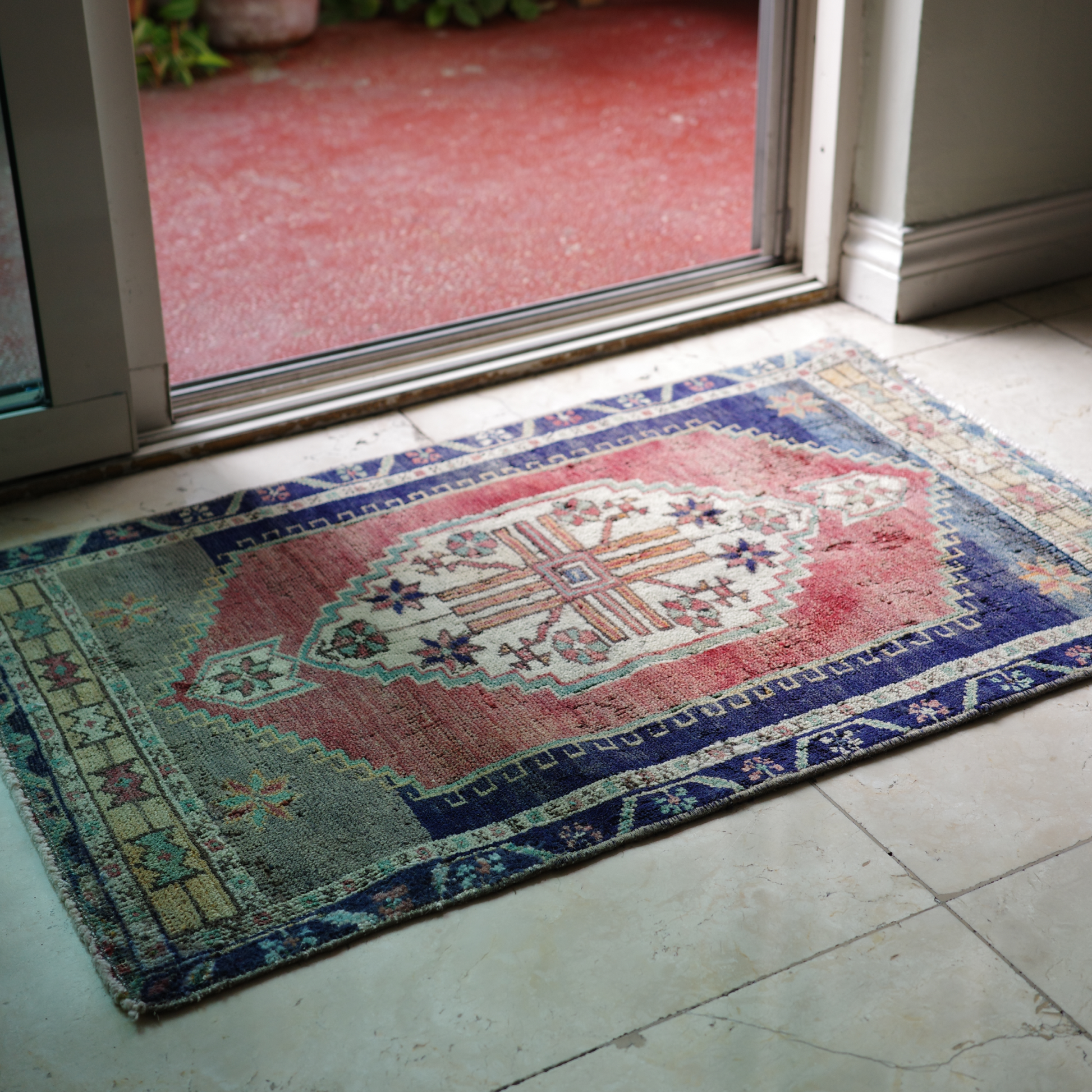 All rugs in the collection are vintage or antique, hand-knotted pieces. Imperfections and color variations reflect their graceful aging and human craftsmanship. Photos were taken under natural light to show their true colors, but they may appear differently in various lighting settings or screens.