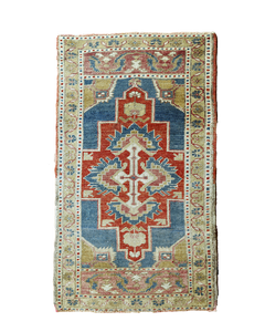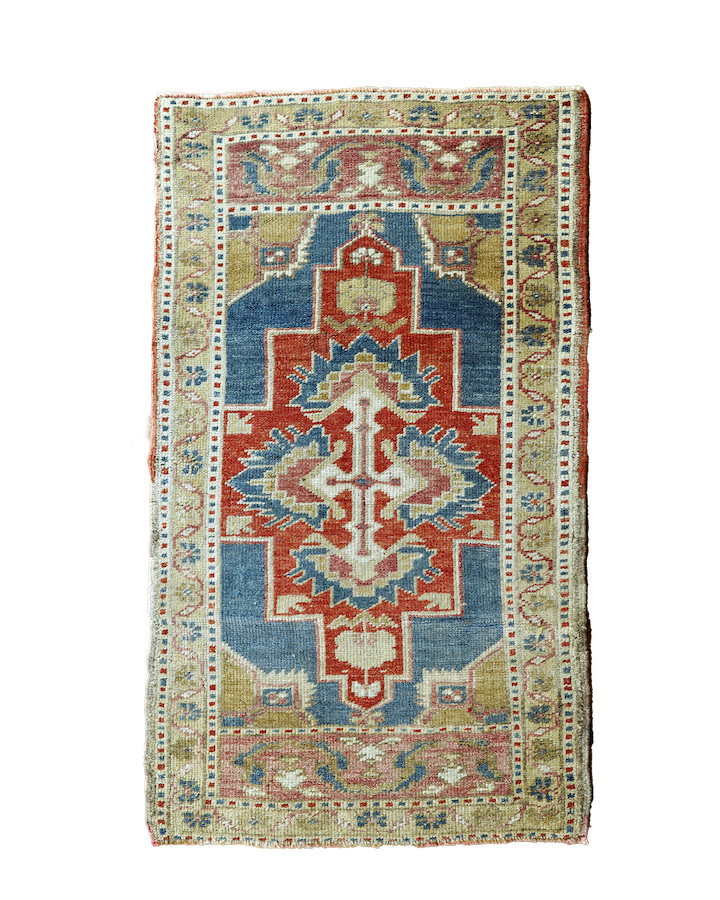 All rugs in the collection are vintage or antique, hand-knotted pieces. Imperfections and color variations reflect their graceful aging and human craftsmanship. Photos were taken under natural light to show their true colors, but they may appear differently in various lighting settings or screens.