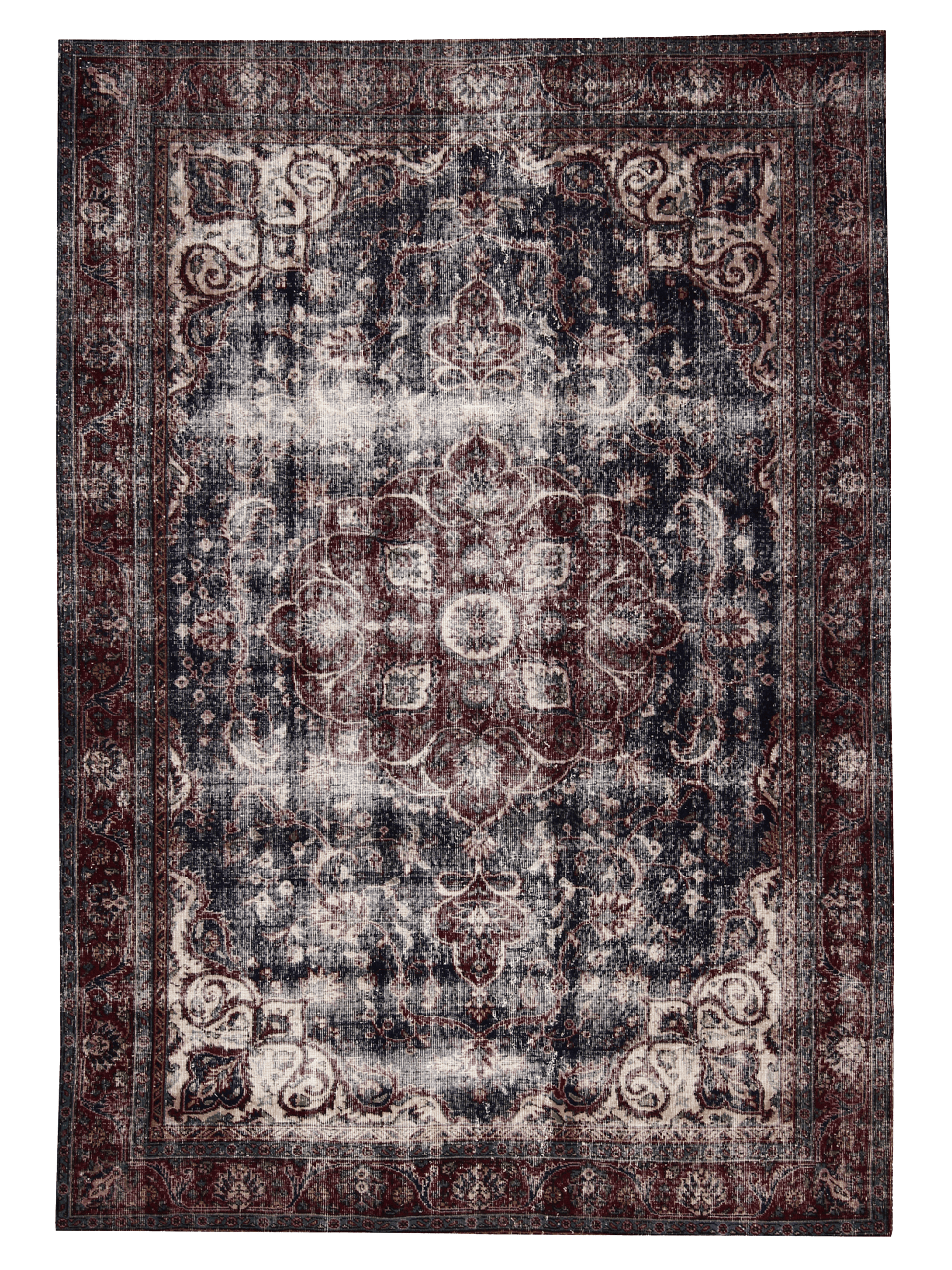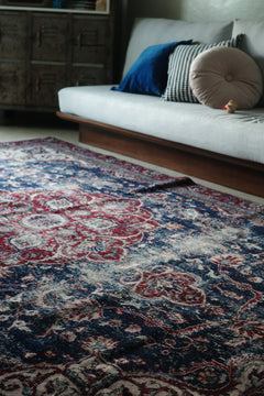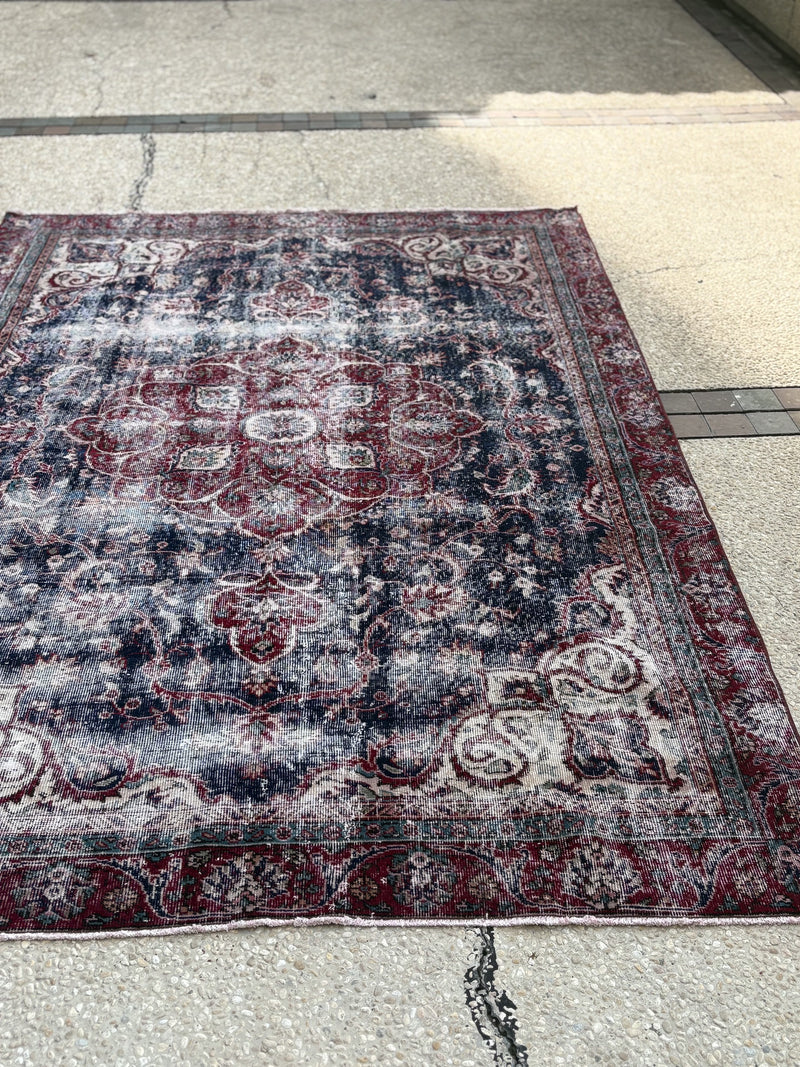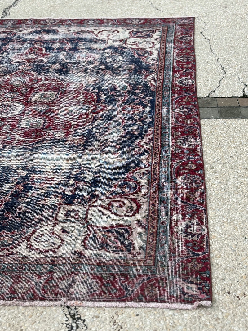 Distressed Persian Kashan Carpet in Deep Red & Navy — No. 134