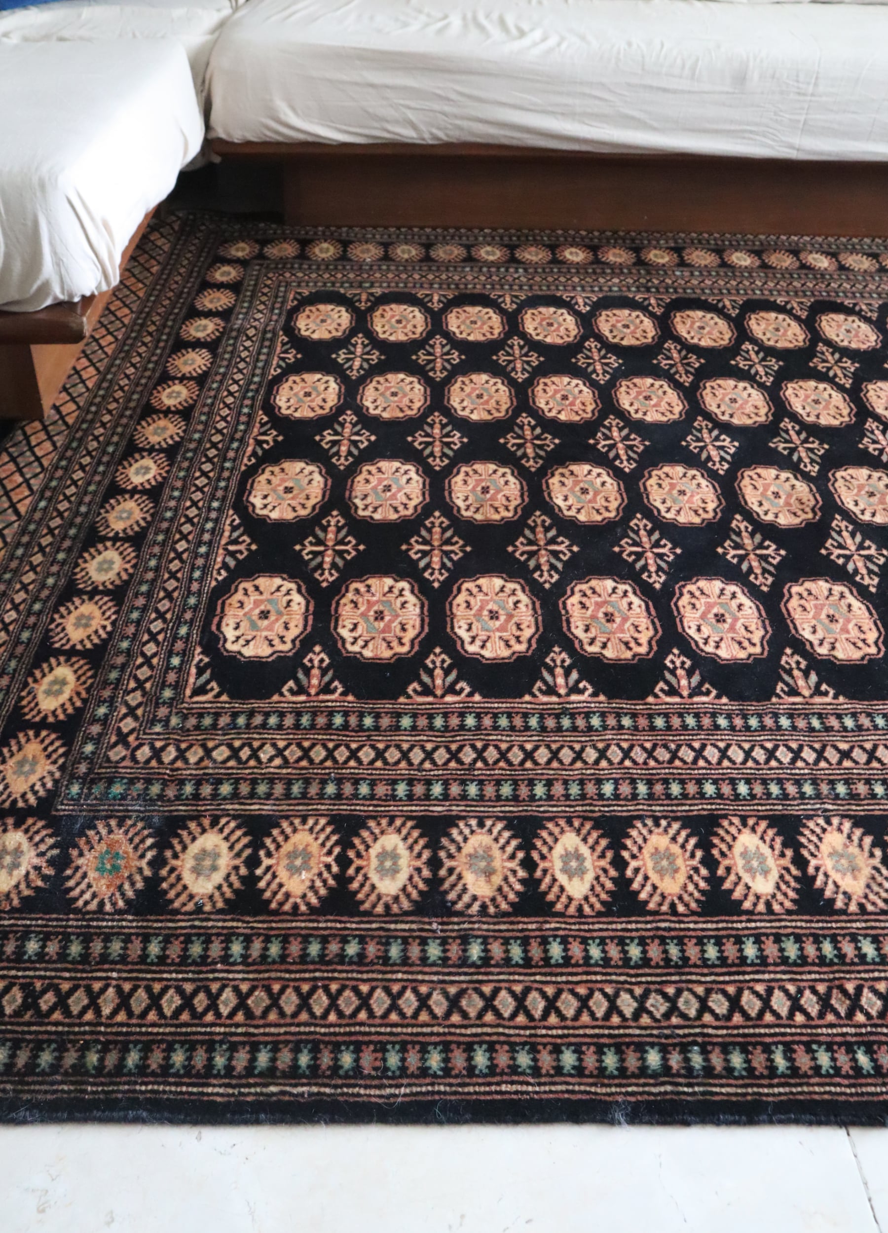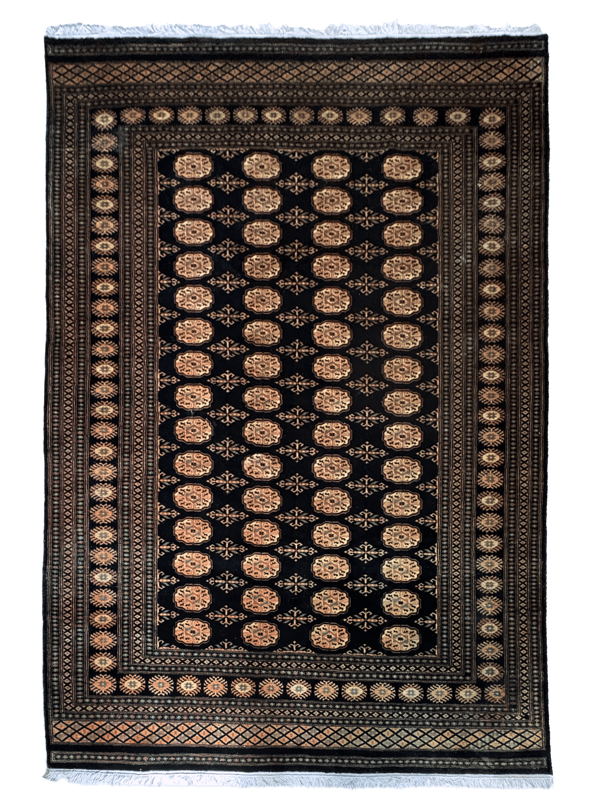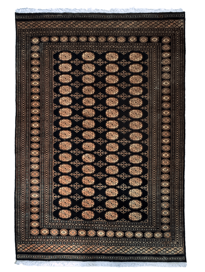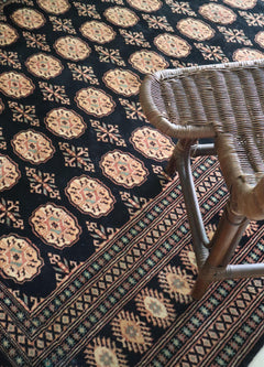 A luxurious Bokhara hand-knotted in Pakistan, featuring the classic Tekke gul pattern repeated across a deep black field. The pile is soft, dense wool with a slight sheen, giving the rug a smooth, velvety surface. The warm gold and camel tones in the guls create a striking contrast that works well in both modern and traditional spaces.