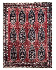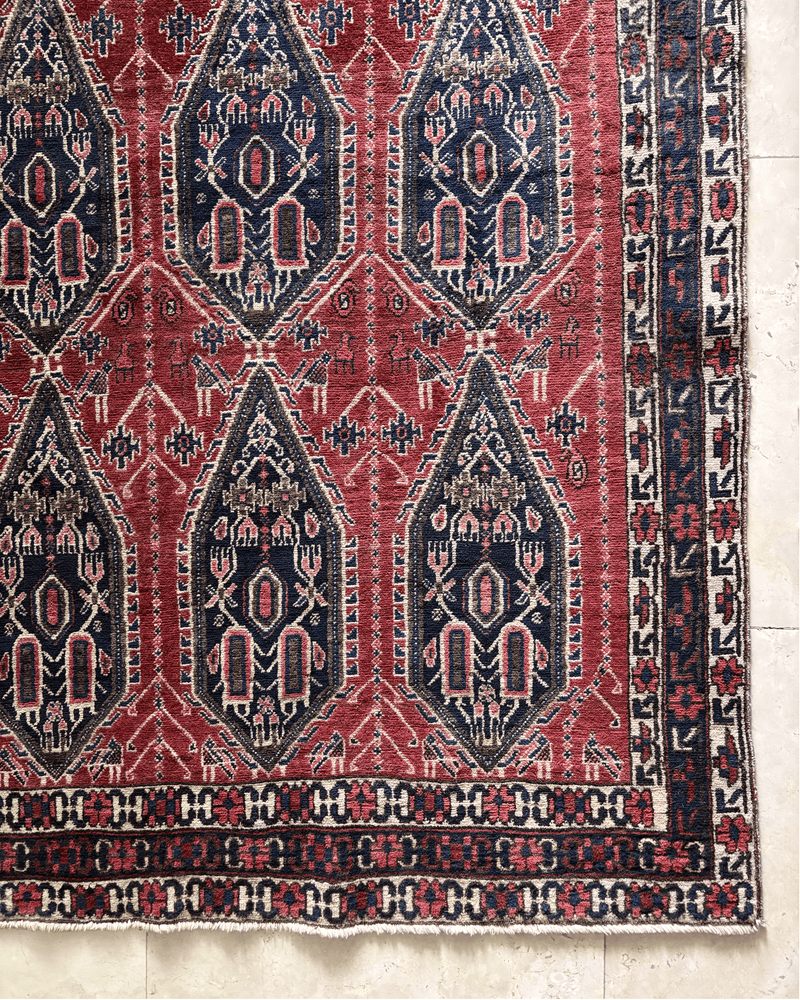 The elongated boteh forms and angular floral detailing are characteristic of Afshar weaving. Framed by traditional Afshar borders in natural dyes, this piece reflects the refined yet earthy aesthetic typical of South-Central Iran’s weaving tradition.