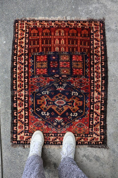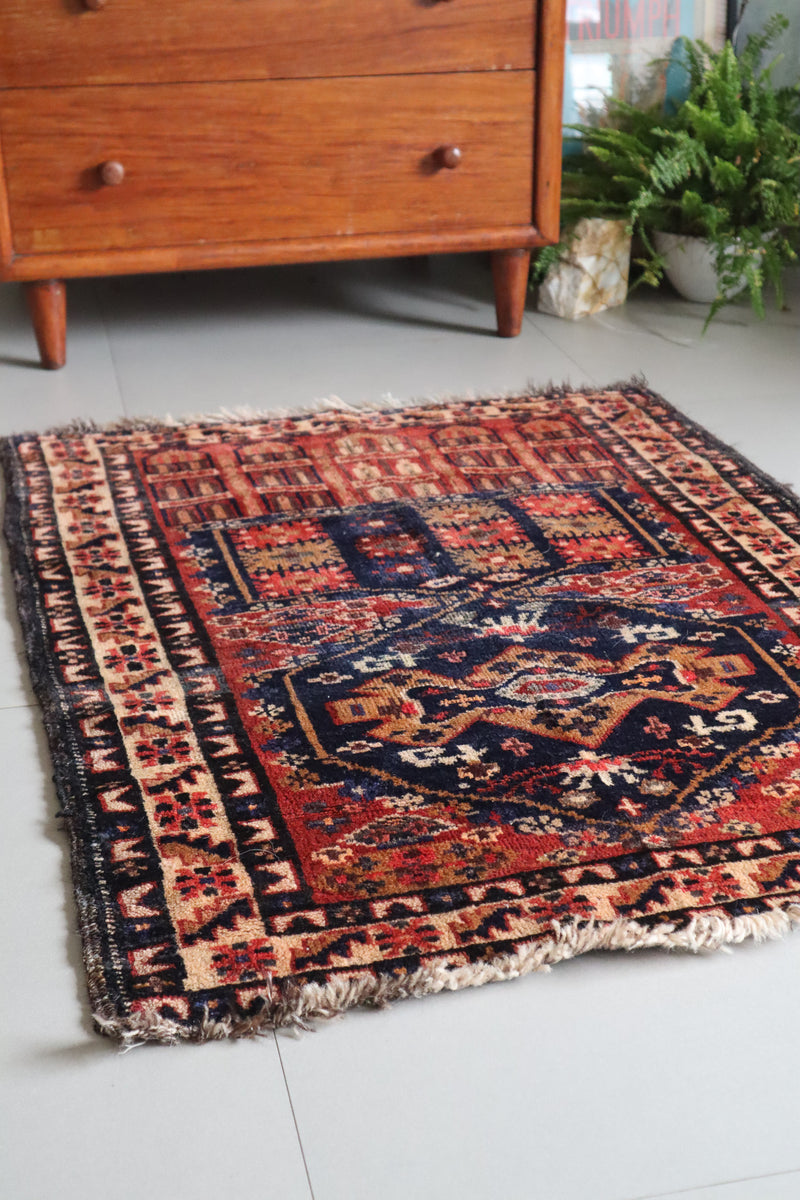 Featuring rust colors, blues, and a touch of cream, this rug is perfect for adding texture and color to any room. Its small size allows for it to be placed in any location and create a soothing atmosphere.