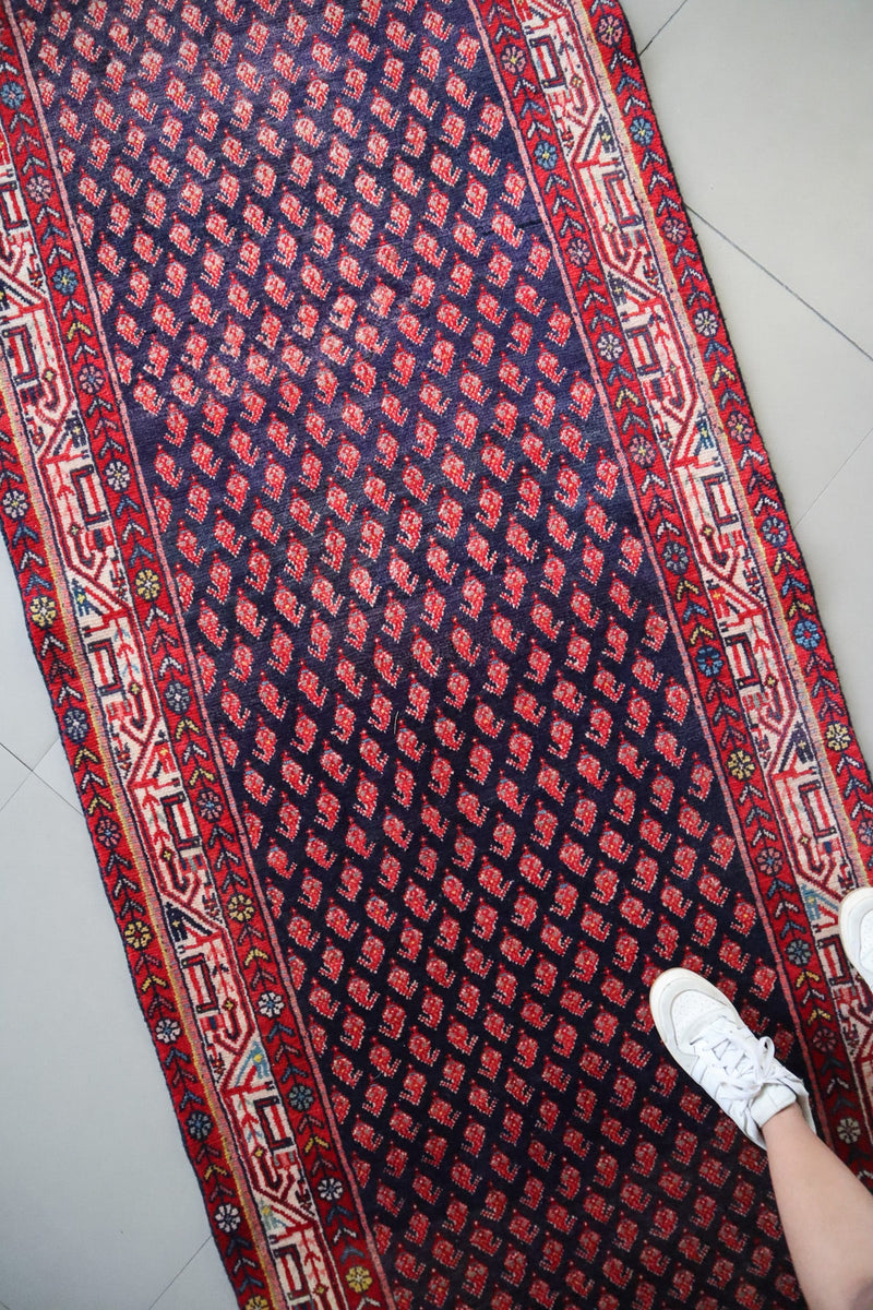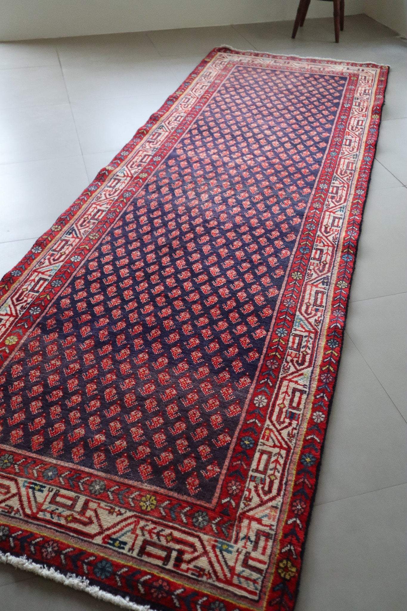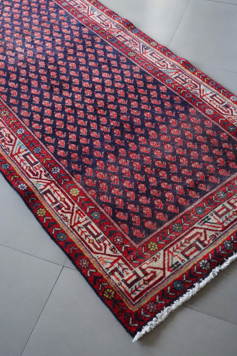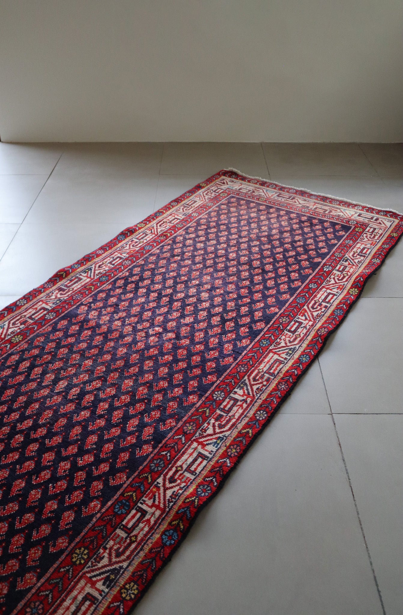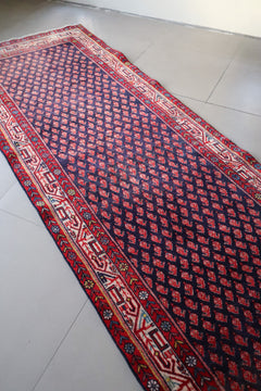 This Persian Saraband Mir runner showcases a classic Boteh pattern, reflecting the renowned Mir weaving tradition. With a blue backdrop, red and beige borders, and lively accents, this piece captures Saraband's cultural heritage in a visually stunning design.