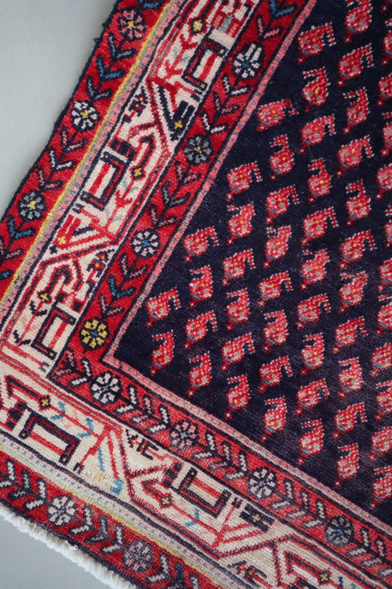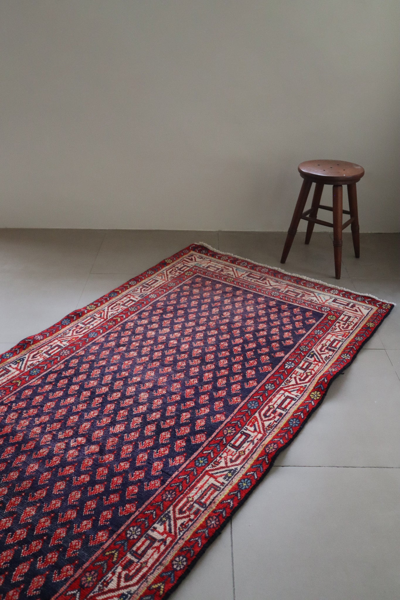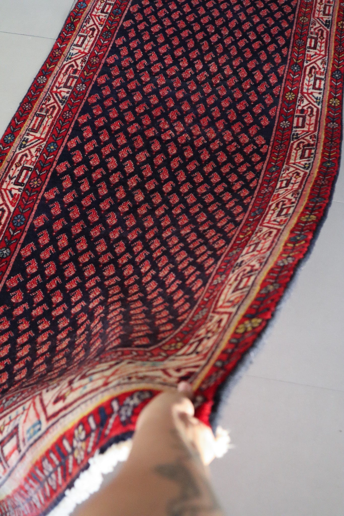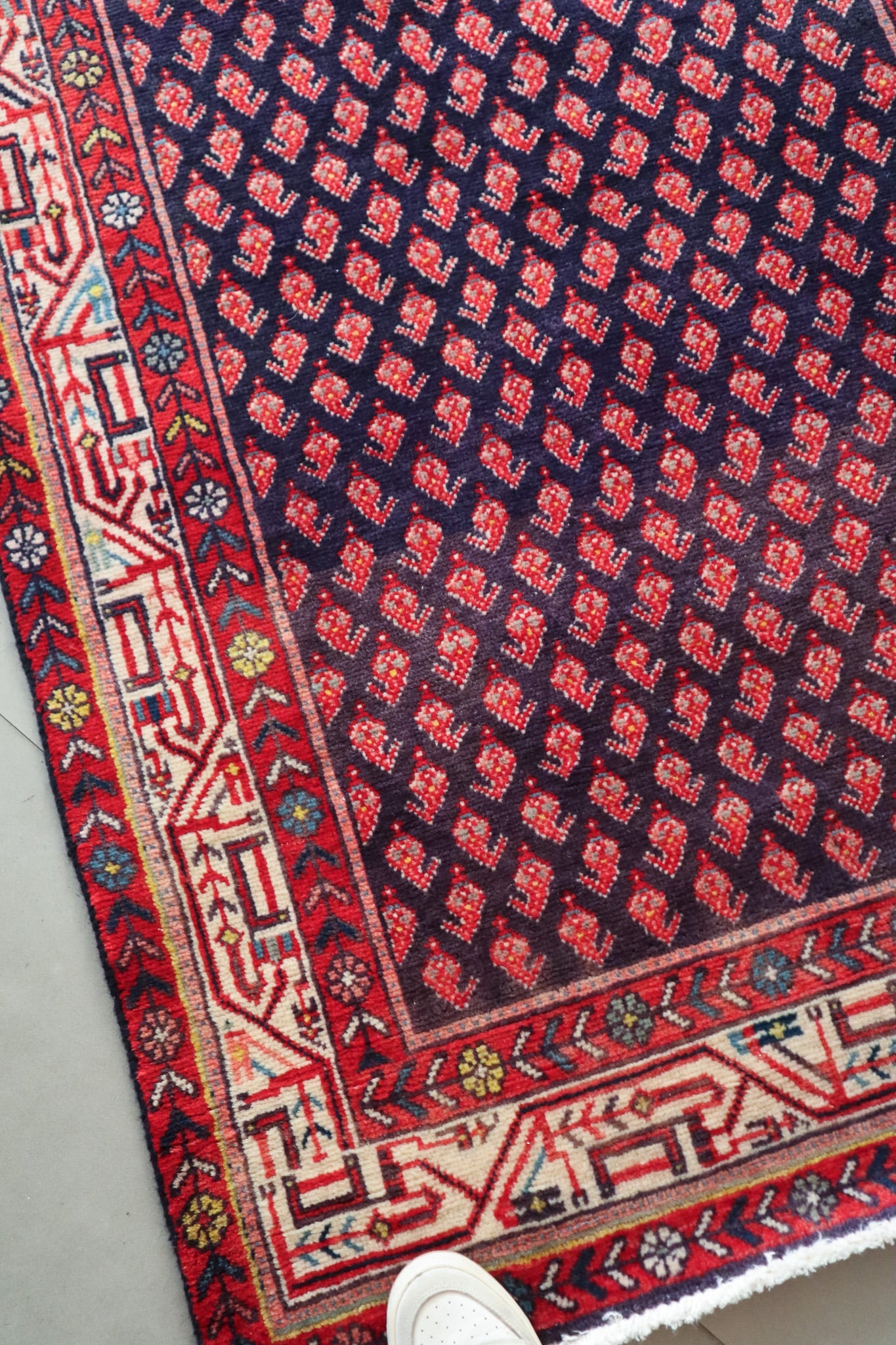 This Persian Saraband Mir runner showcases a classic Boteh pattern, reflecting the renowned Mir weaving tradition. With a blue backdrop, red and beige borders, and lively accents, this piece captures Saraband's cultural heritage in a visually stunning design.