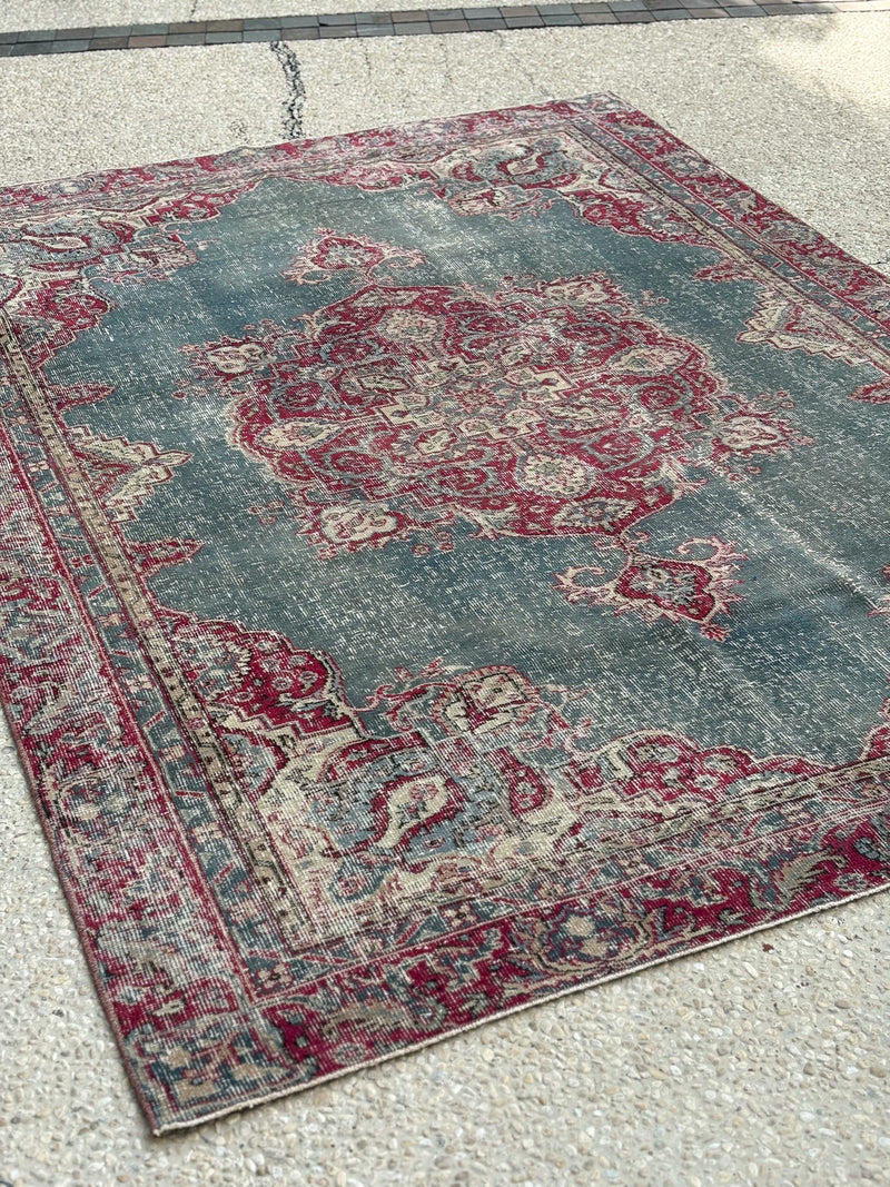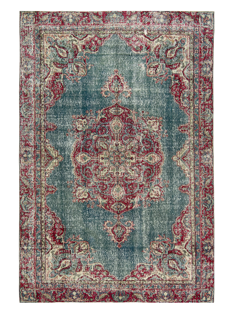 A reimagined Kerman classic — bold medallion, scrolling borders, and a turquoise field gently washed to reveal layers of rose and ivory beneath. The distressed finish brings old-world patterning into a softer, modern light.