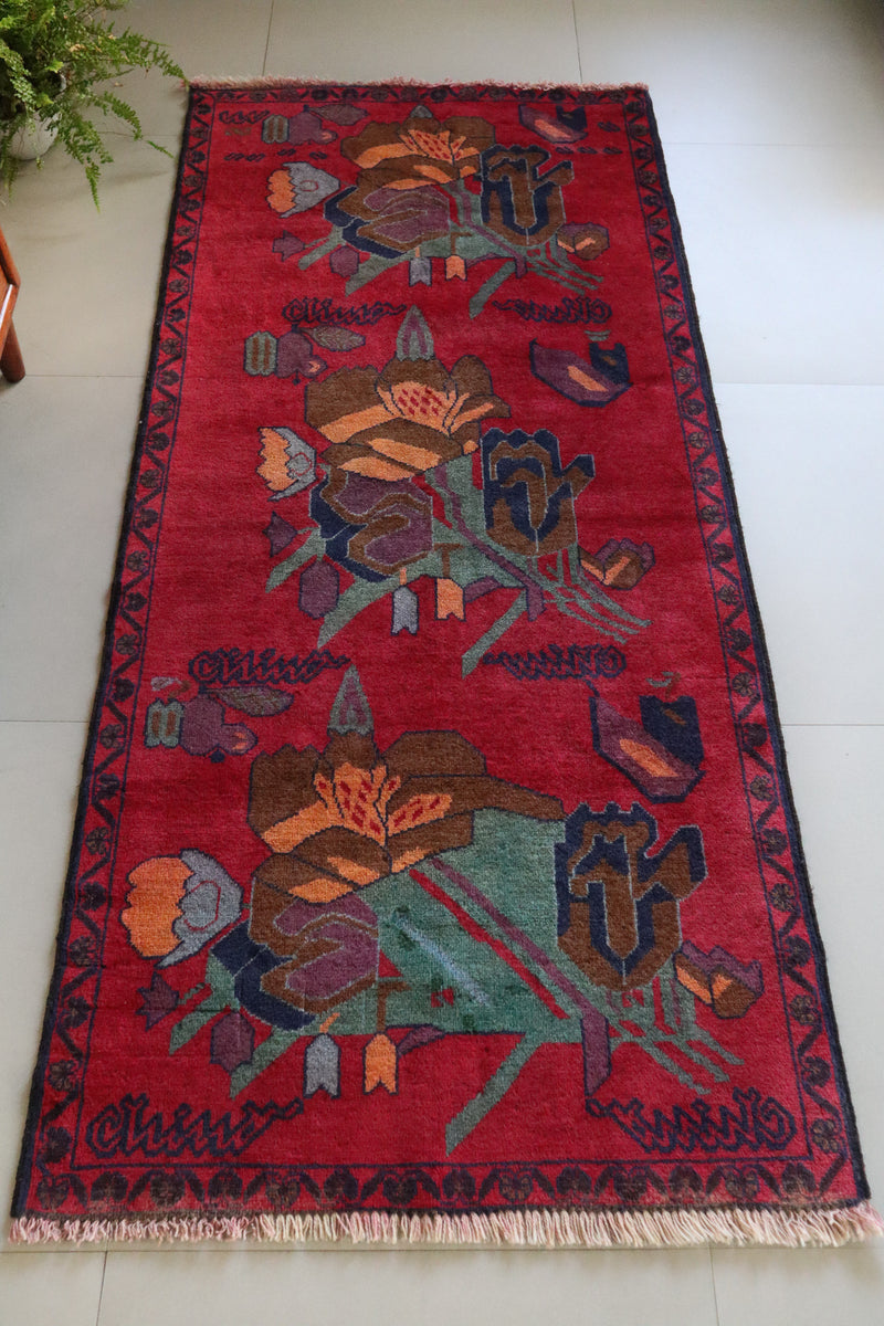 A Tibetan Rug with a luxurious red backdrop, adorned with blooming floral designs and crafted from lustrous wool - an eclectic masterpiece!