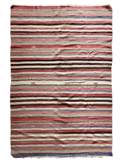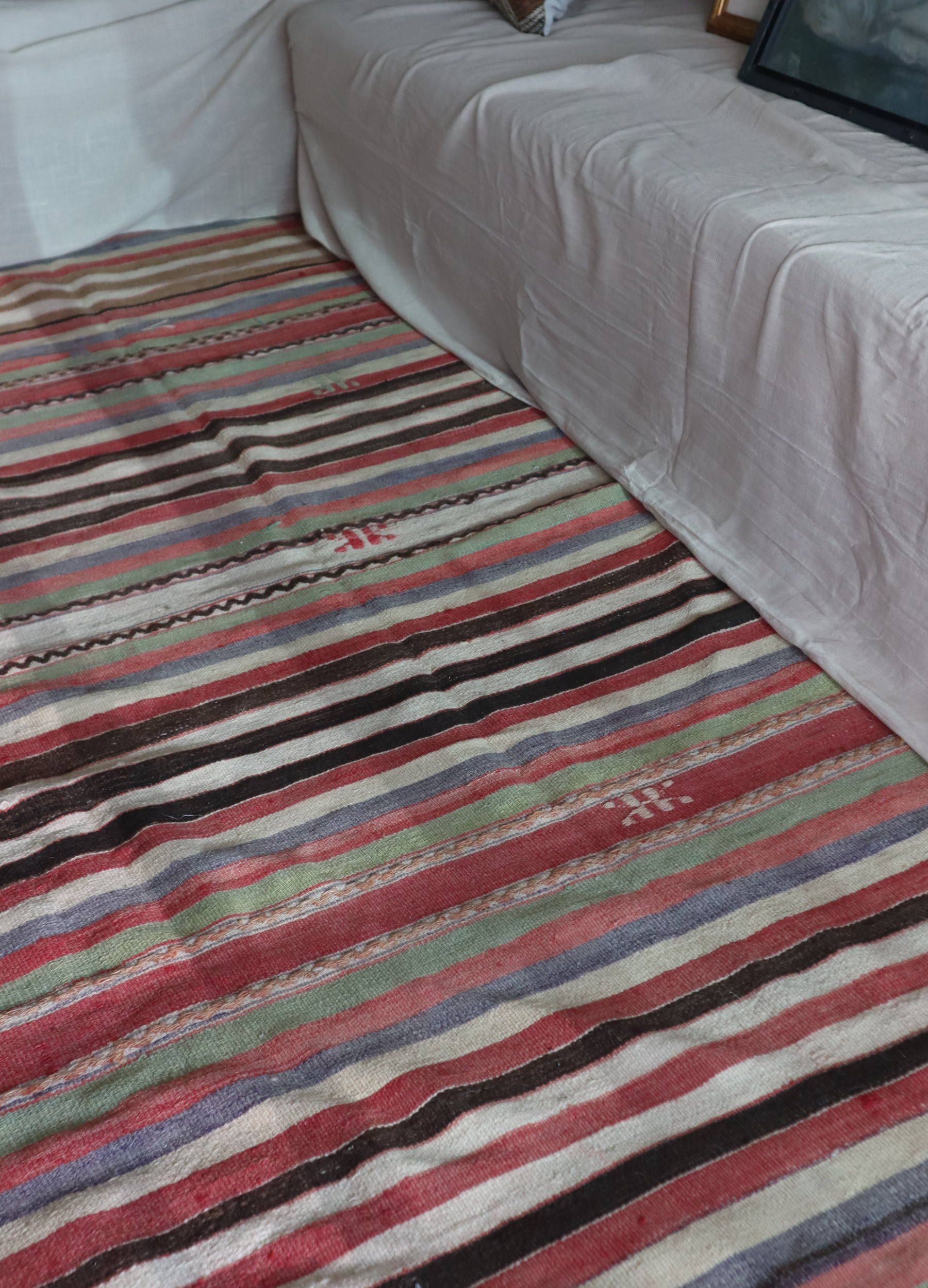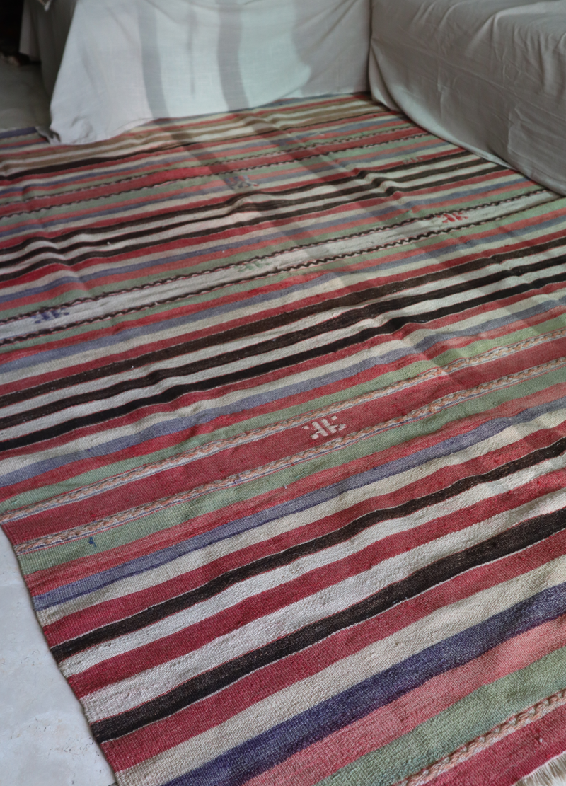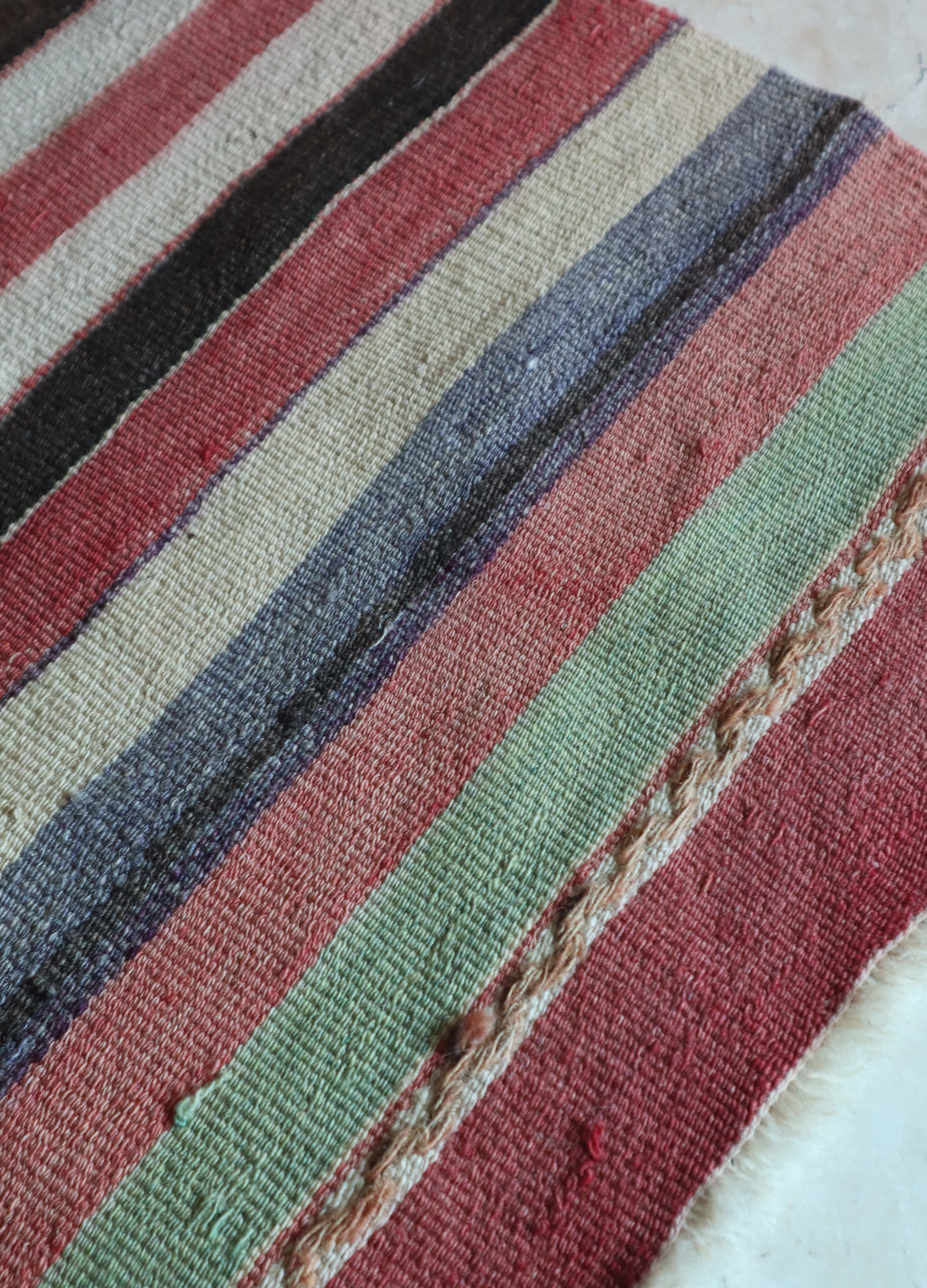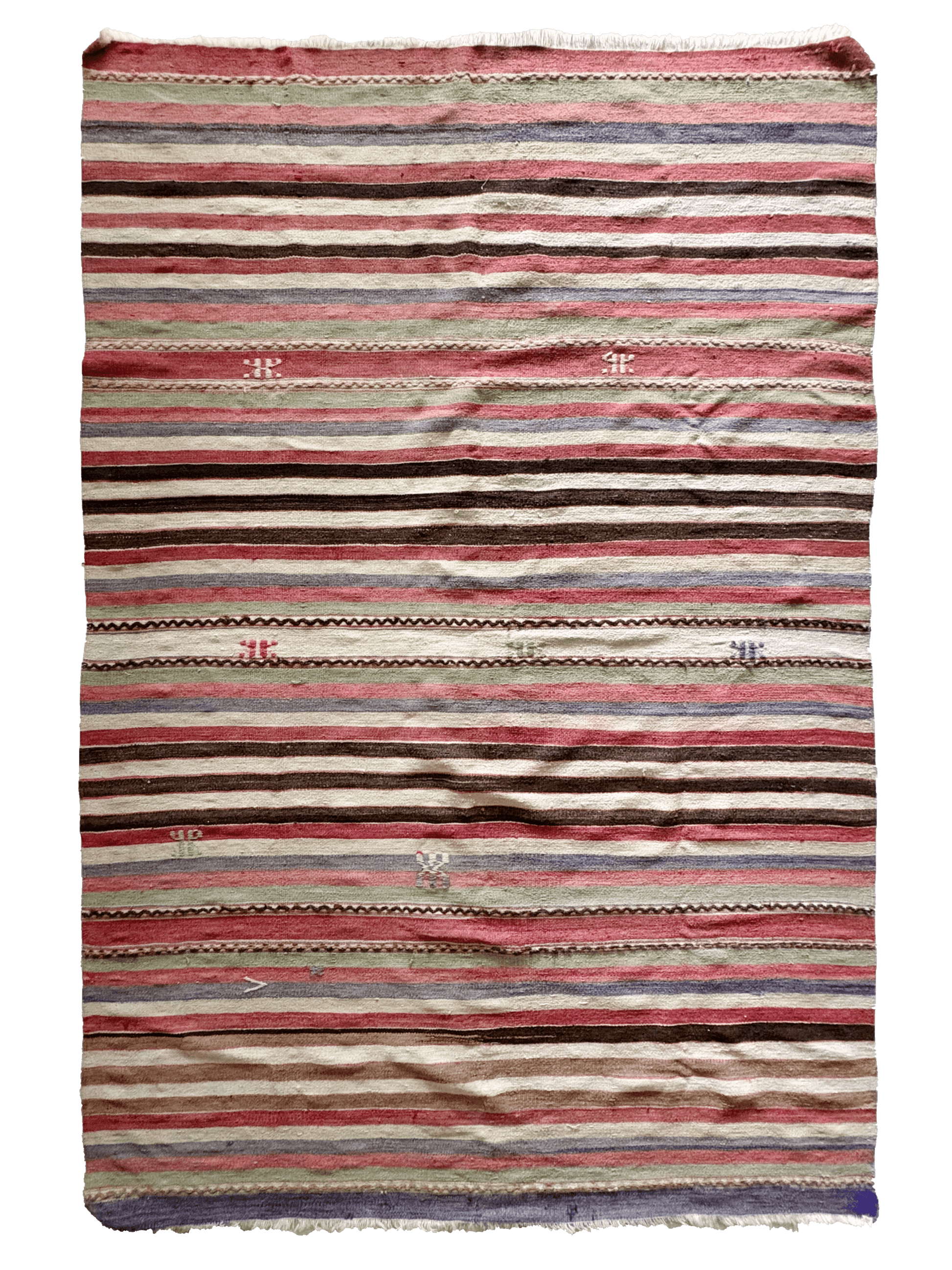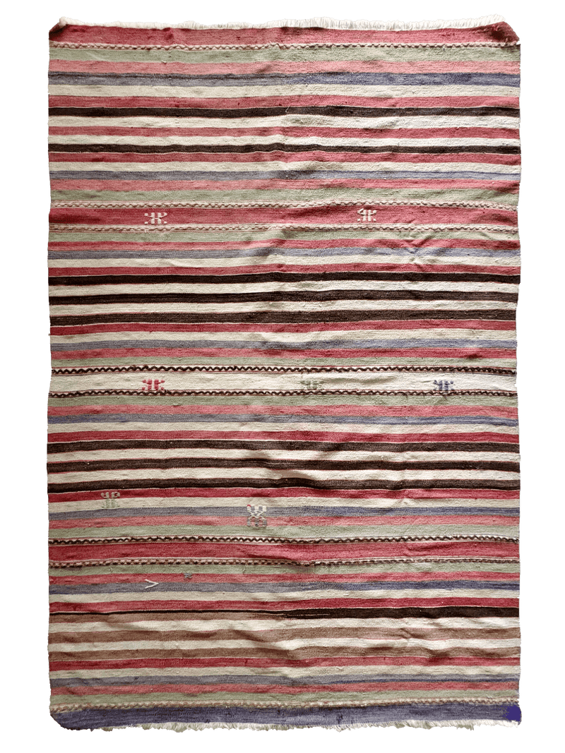 Vintage Turkish Sivas Kilim (c. 1960s–1970s) Handwoven wool flatweave featuring narrow horizontal stripes in rose, sage, lavender, and walnut tones with small protective motifs woven in relief. A soft, minimal Anatolian kilim that captures the airy palette and craftsmanship of mid-century Turkish weaving.