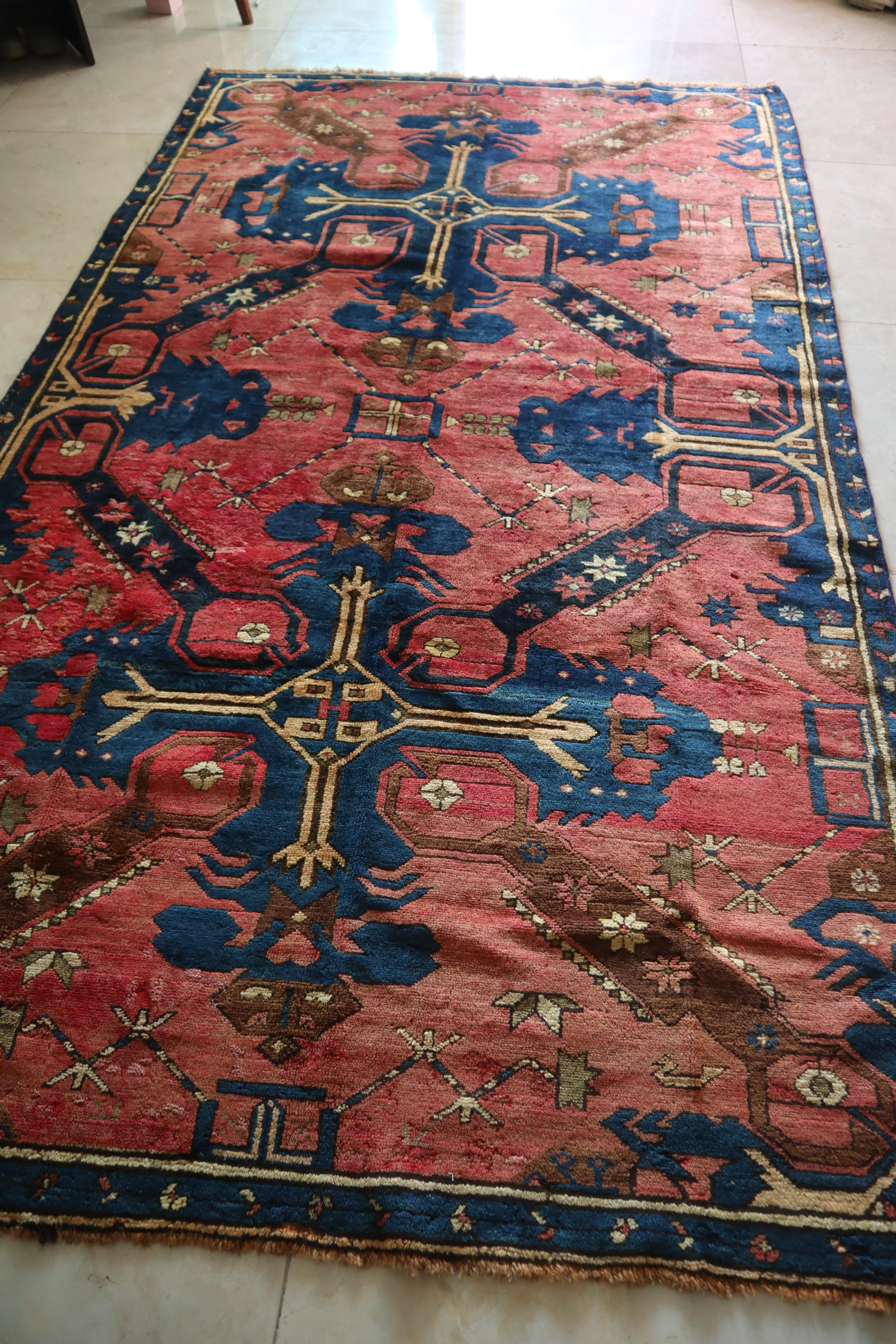 Woven mid-century, likely for a family home, this is a tribal Caucasian rug with a rare coral field— a color often tied to vitality and domestic blessing. Three hooked medallions anchor the center, their spurred arms echoing protective motifs seen across the South Caucasus. Starbursts, rosettes, and totemic forms scatter the open ground like wayfinders, balancing the structure with rhythm and breath.