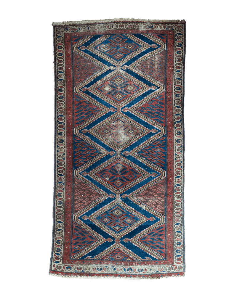 This rug has been professionally cleaned; age-related wear and natural inconsistencies are inherent in these unique, handcrafted vintage rugs.
