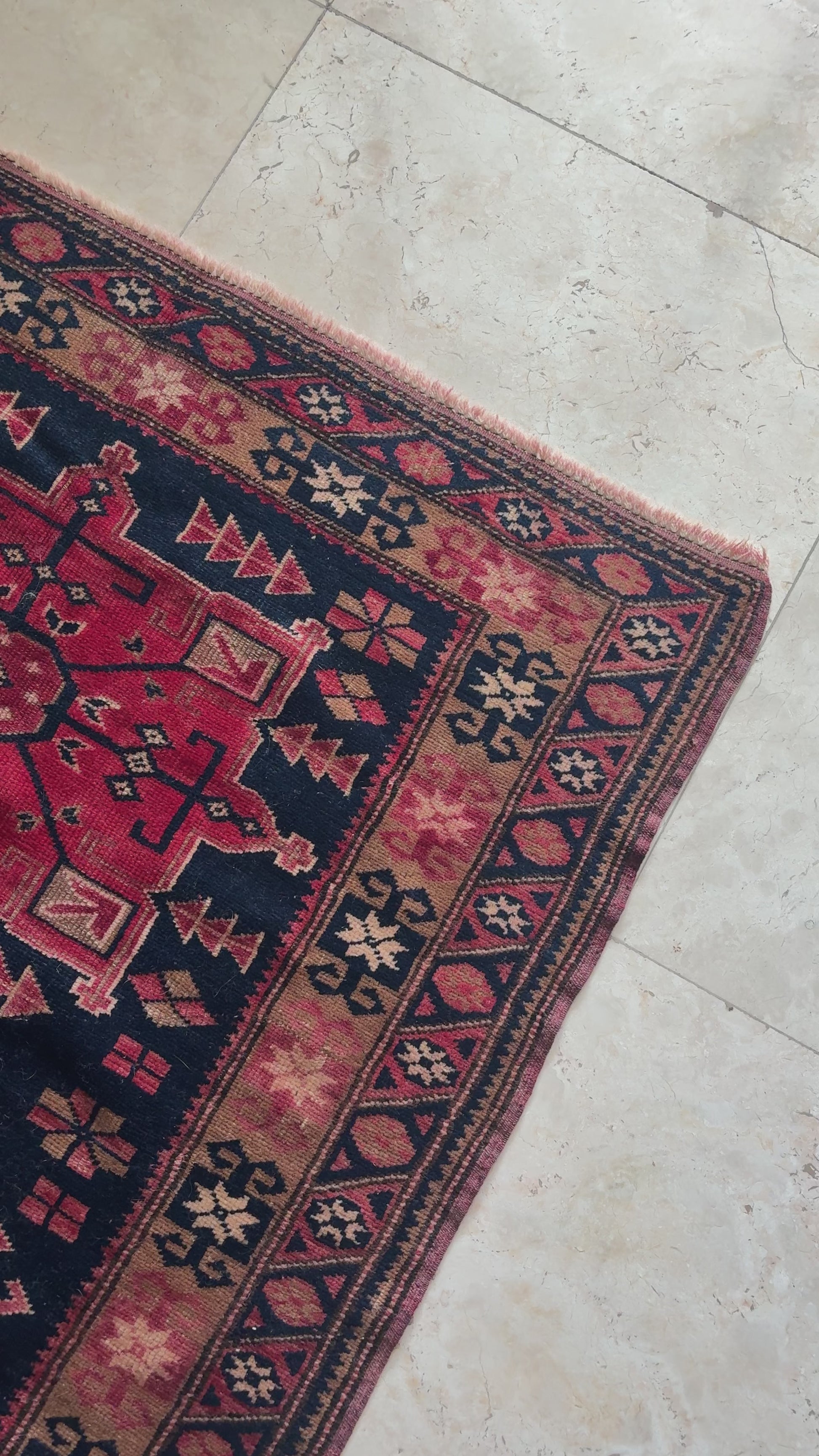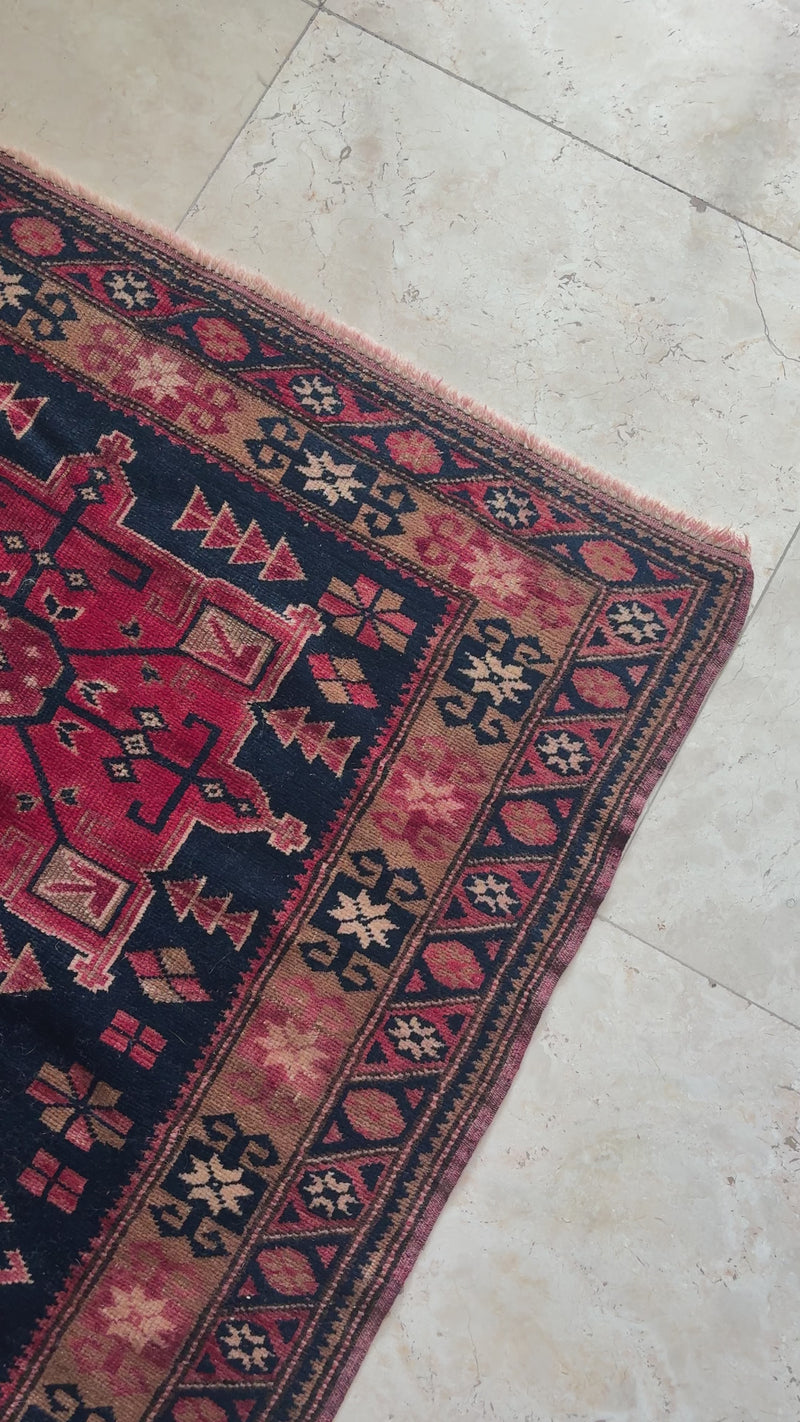 This rug has been professionally cleaned; age-related wear and natural inconsistencies are inherent in these unique, handcrafted vintage rugs.