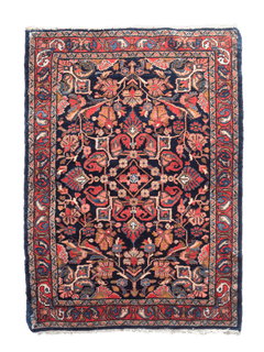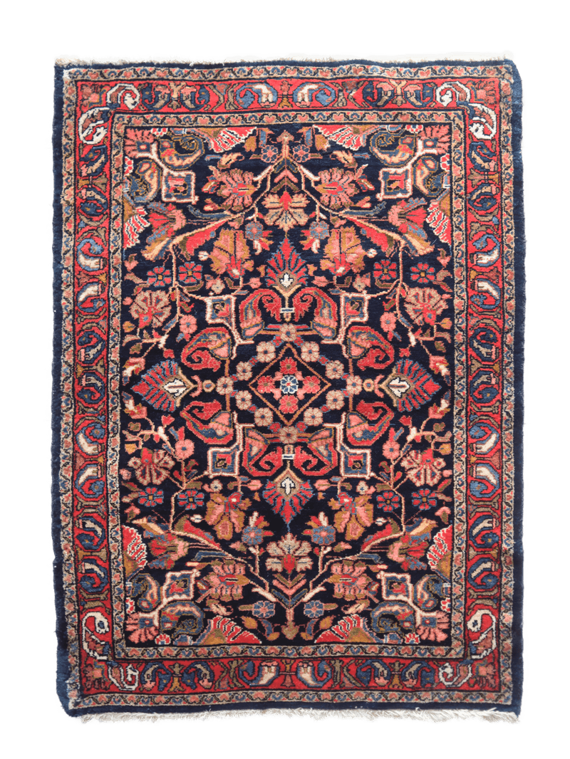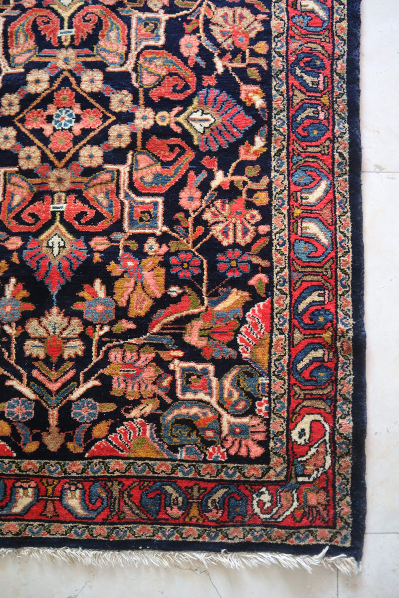 This vintage Persian rug holds a classic Hamadan rhythm, structured florals climbing a deep navy field, framed by scrolling vine borders. The coral and rose tones glow against the indigo, giving the whole piece a warmth that reads both formal and familiar.