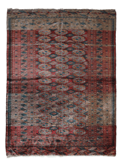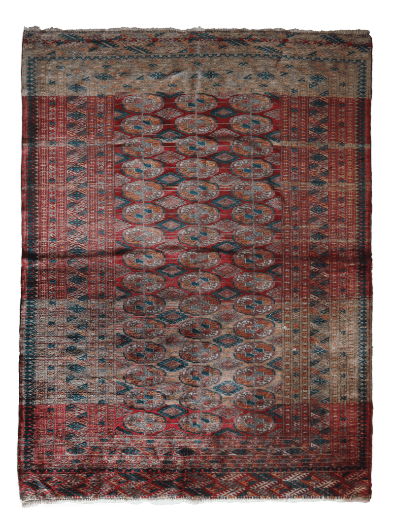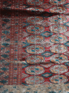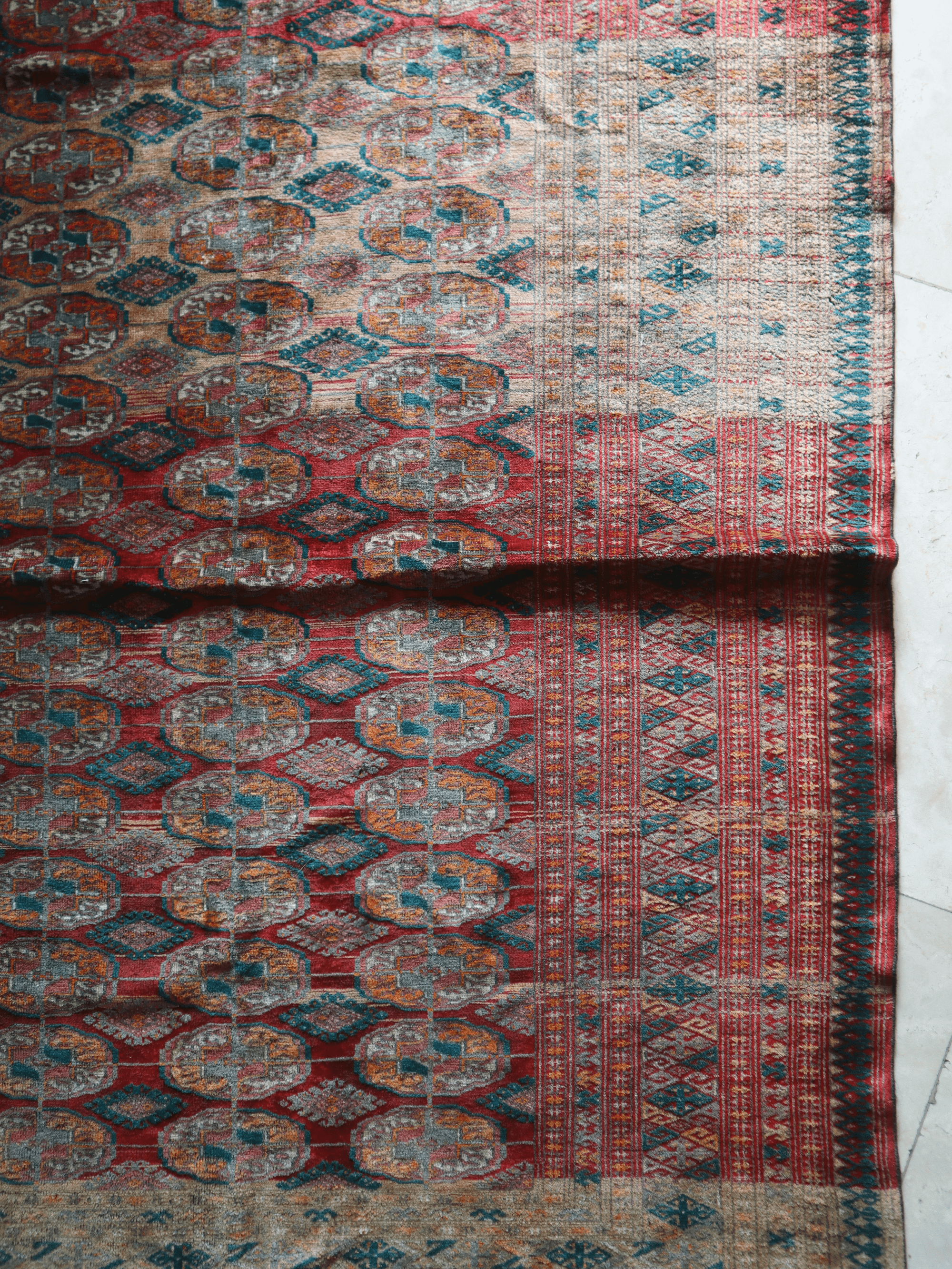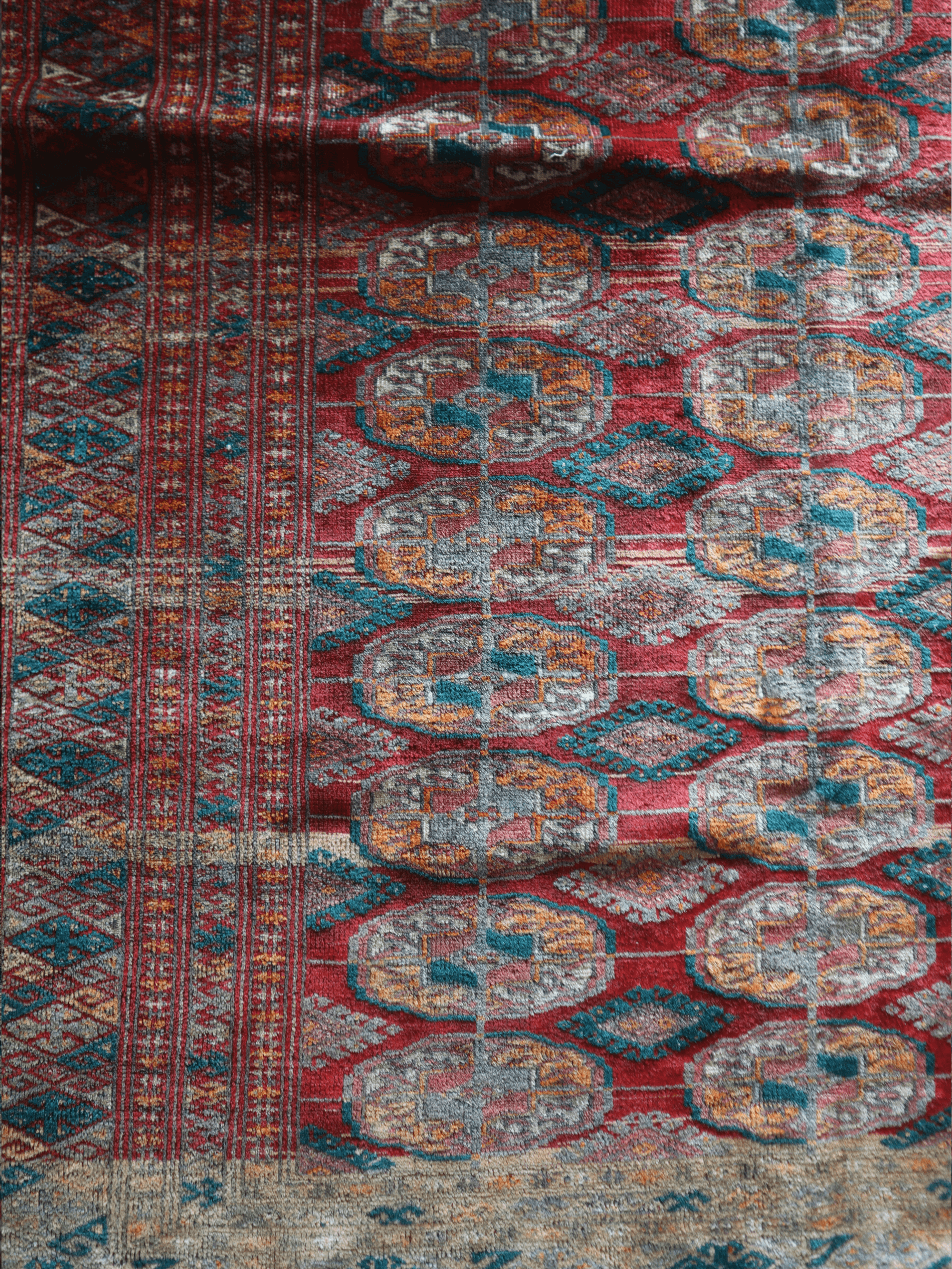 A softened field of madder red, broken by rows of worn Tekke guls, this luminous mid-century piece shows its tribal roots in repetition and restraint. The deep border still holds its rhythm, while the center has faded to a chalky rose, almost skin-toned in parts. Woven by Turkoman hands, likely for everyday use, it carries the calm dignity of a rug that’s done its job well.